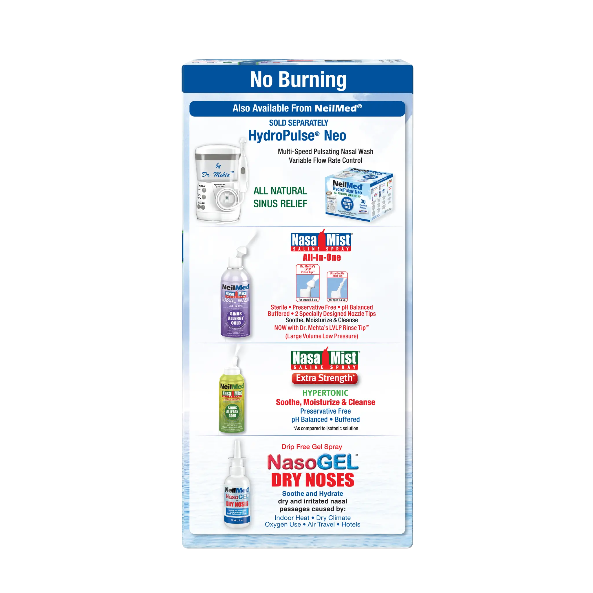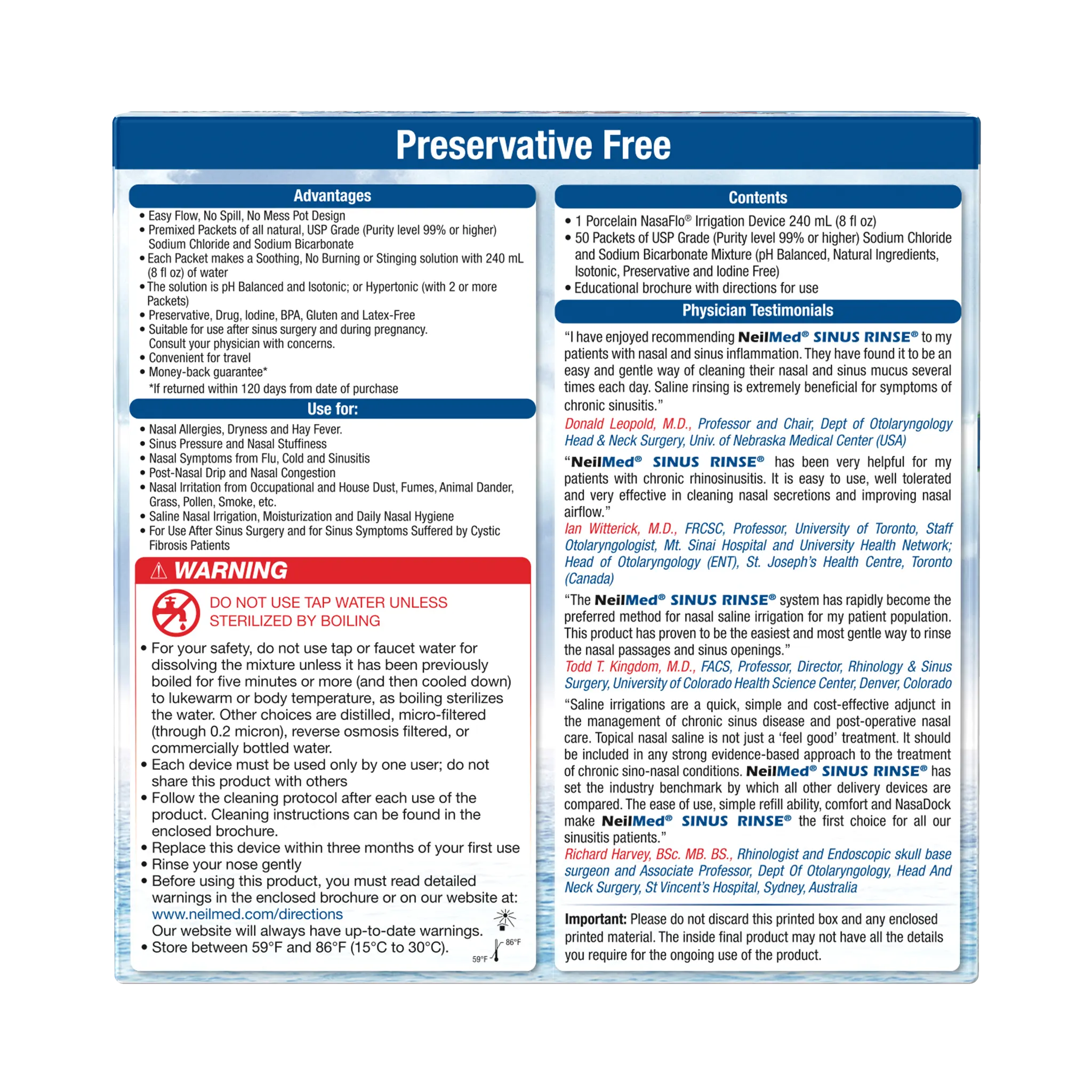 Saline Nasal Irrigation, Moisturization and Daily Nasal Hygiene, Nasal Allergies, Dryness & Hay Fever Sinus Pressure & Nasal Stuffiness Nasal Symptoms from Flu, Cold & Sinusitis, Nasal Irritation from Occupational & House Dust, Fumes, Animal Dander, Grass, Pollen, Smoke, etc. Post Nasal Drip & Nasal Congestion, After Sinus Surgery and for Cystic Fibrosis Patients