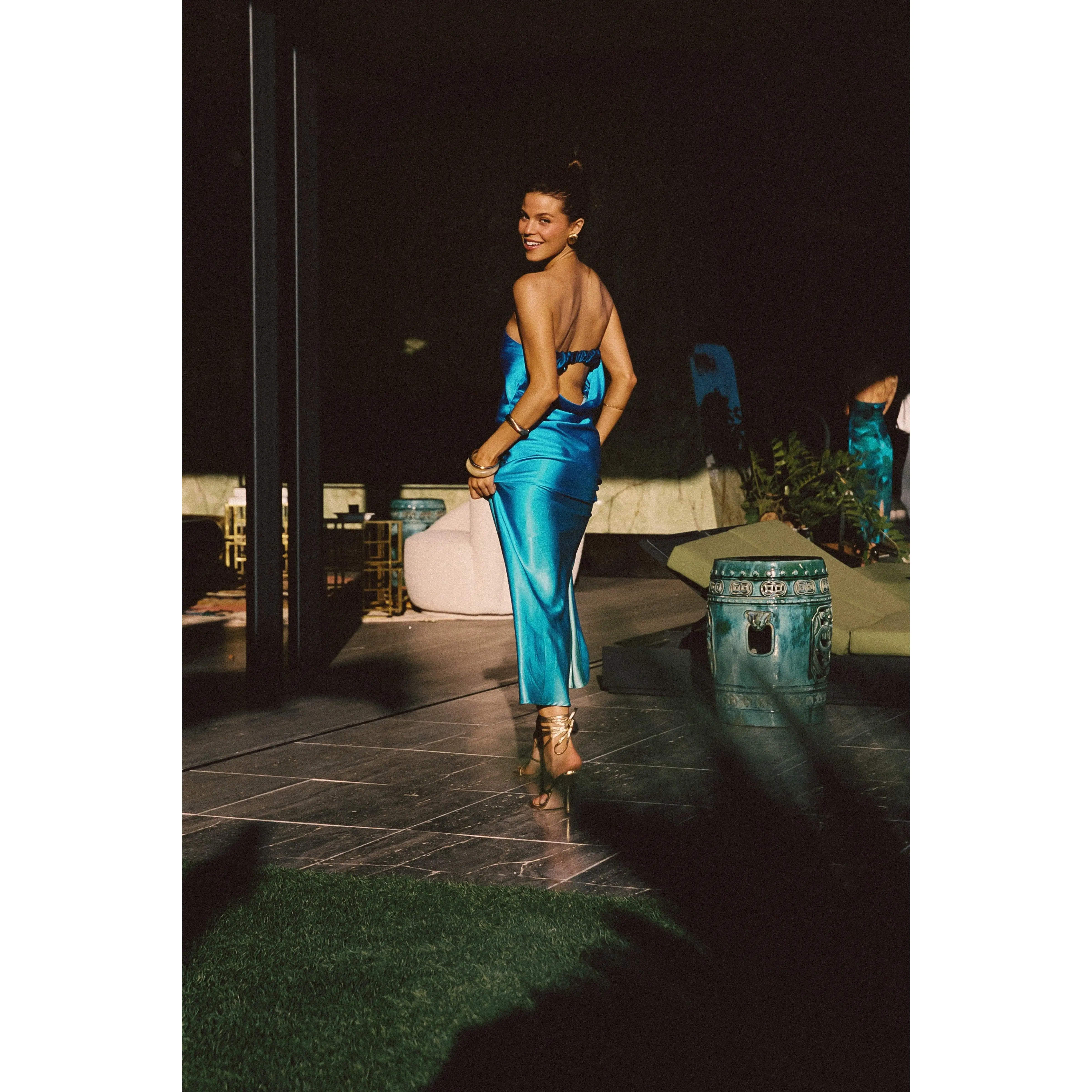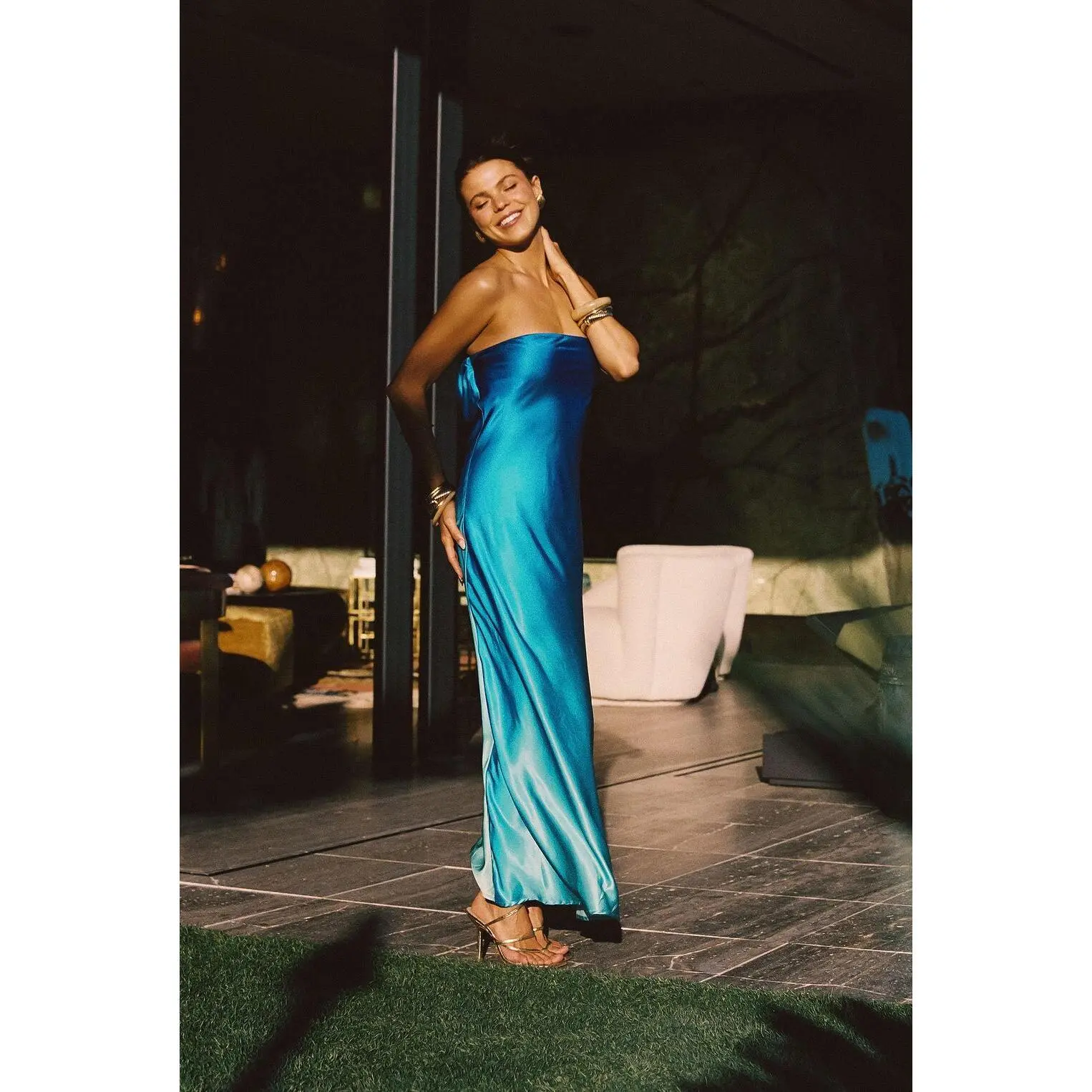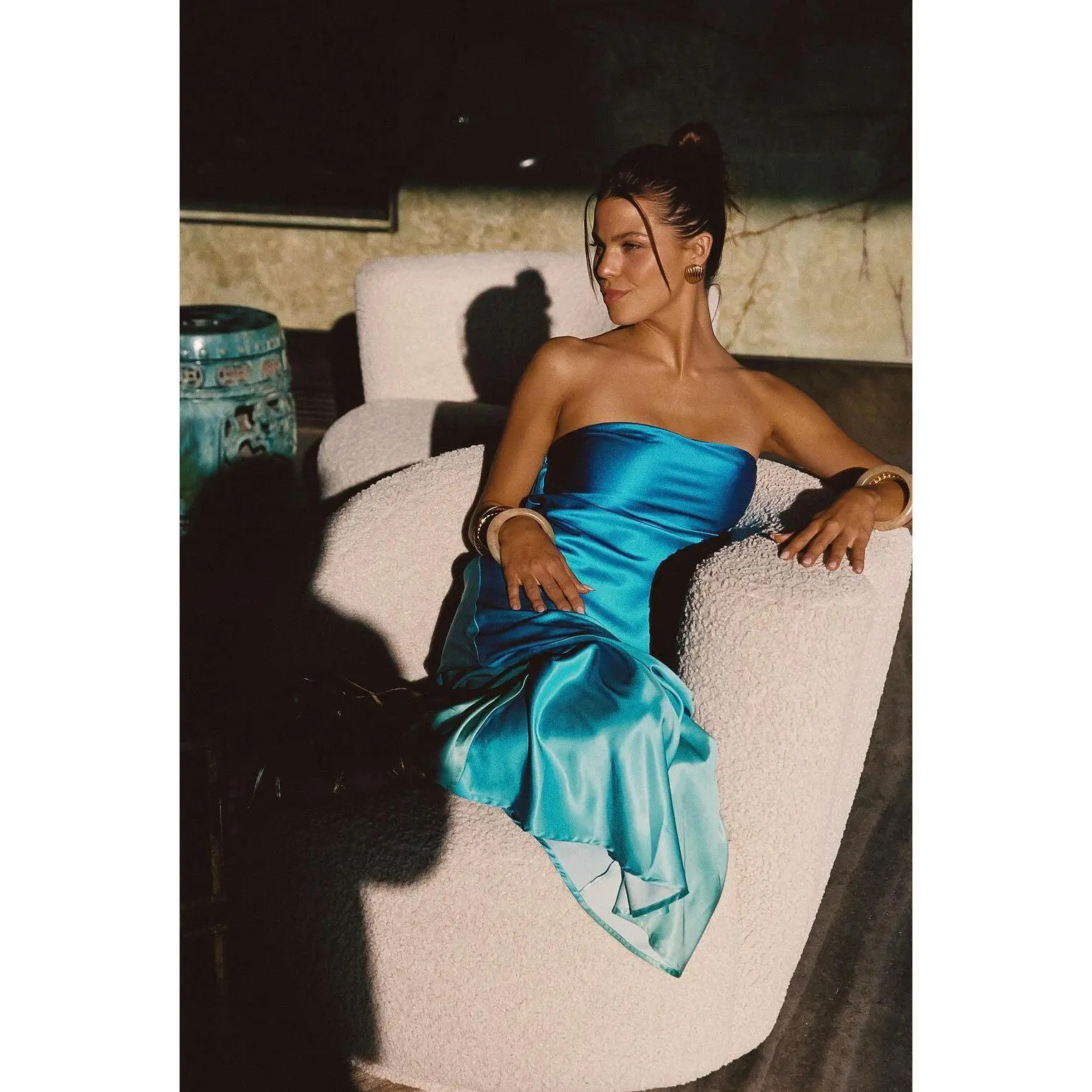 So stunning 💙🩵 @12TH TRIBE #maxidress #straplessdress #satindress #weddingguestdress #vacationdress