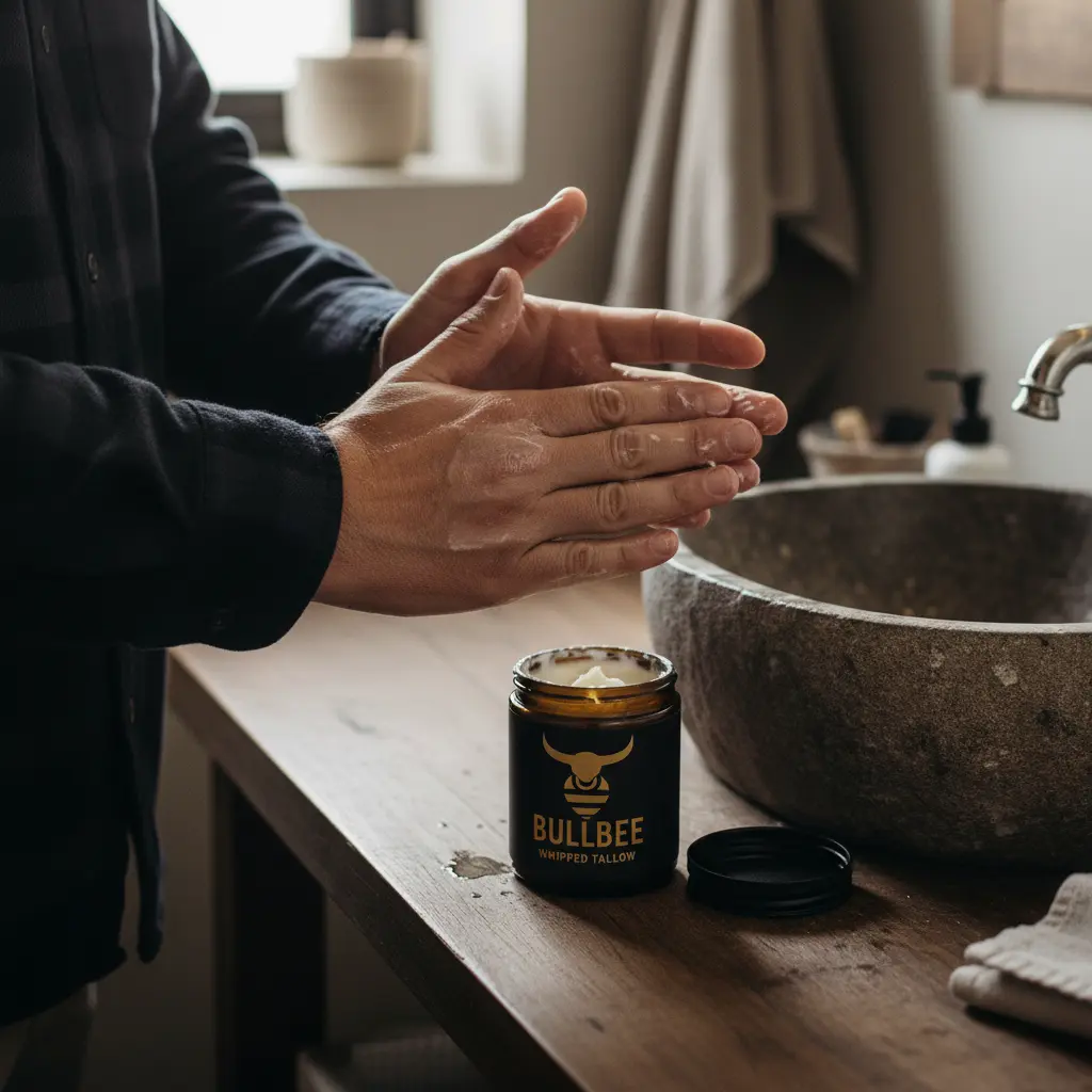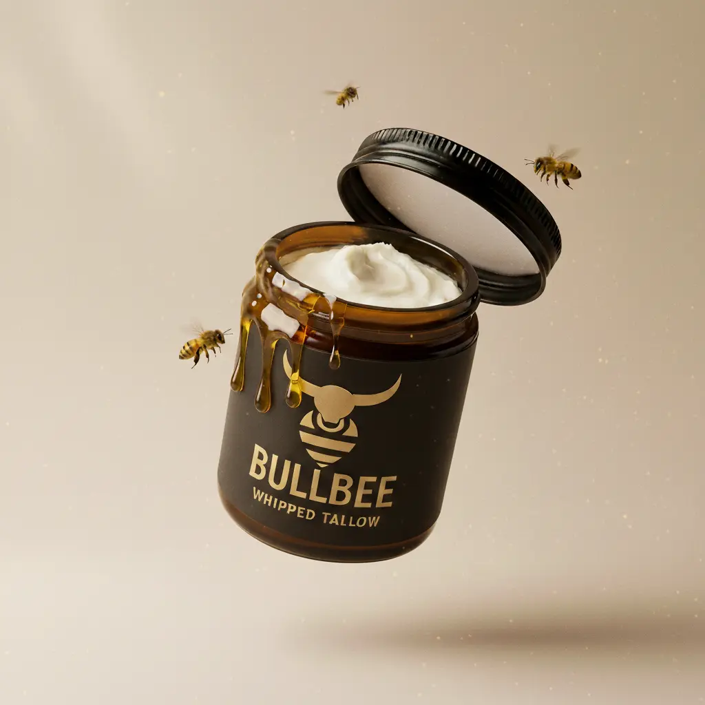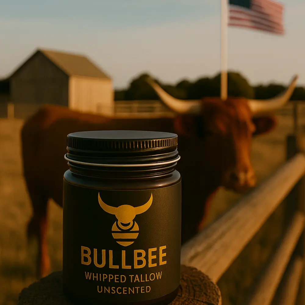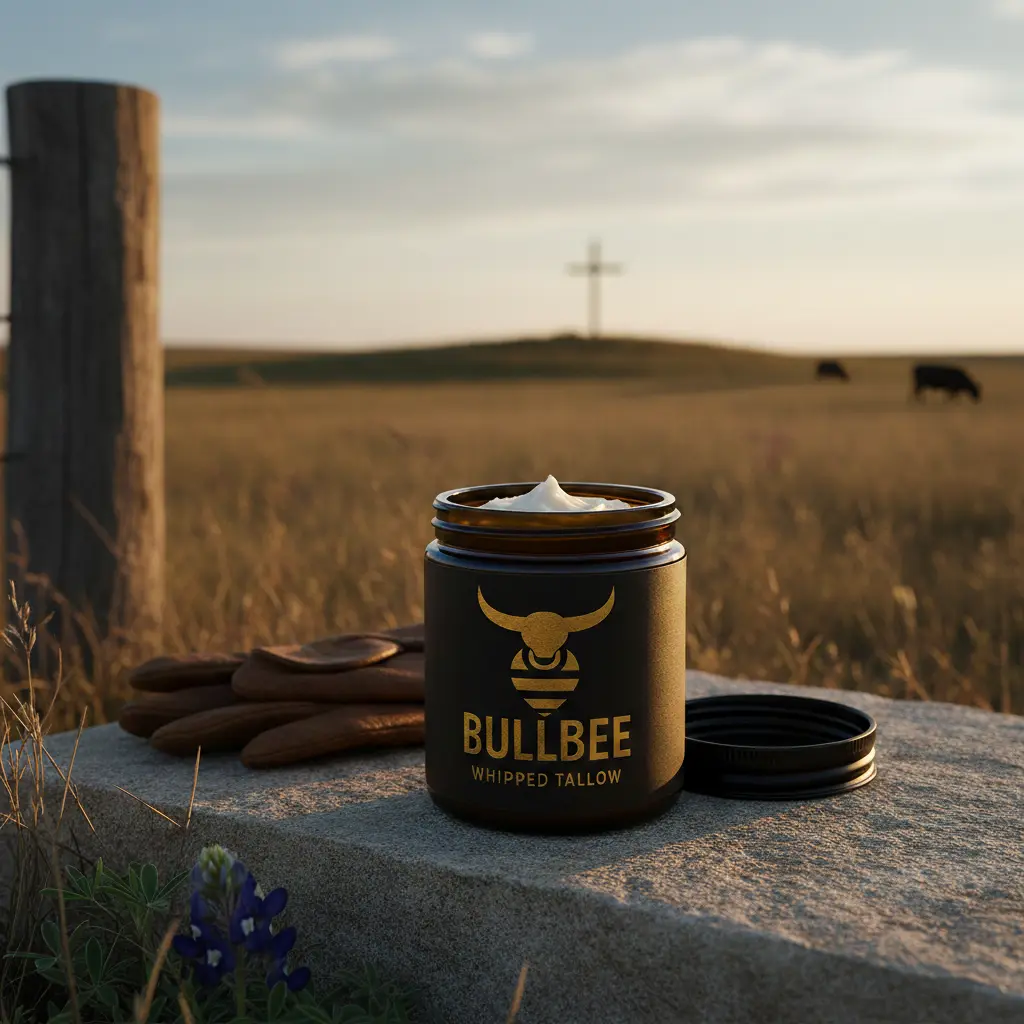 BULLBEE Whipped Tallow is real skincare — made from 100% Grass-Fed, Grass-Finished Beef Tallow, sourced from local Texas farmers, blended with Beeswax, Raw Honey, and Vanilla Bean-Infused Jojoba Oil. Never more than 4 ingredients. No chemicals, no synthetic preservatives, no fillers. Small-batch, handcrafted in Texas, USA.