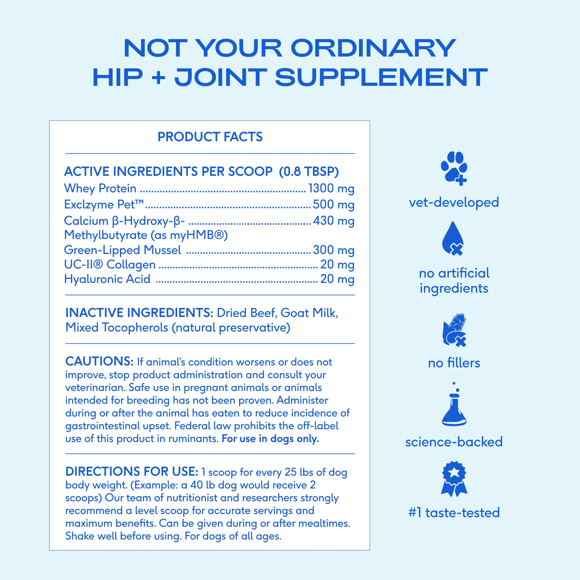HMB preserves muscle mass, protecting joints under stress. UC-II Collagen supports cartilage regeneration for dogs of all sizes, ages, and activity levels.