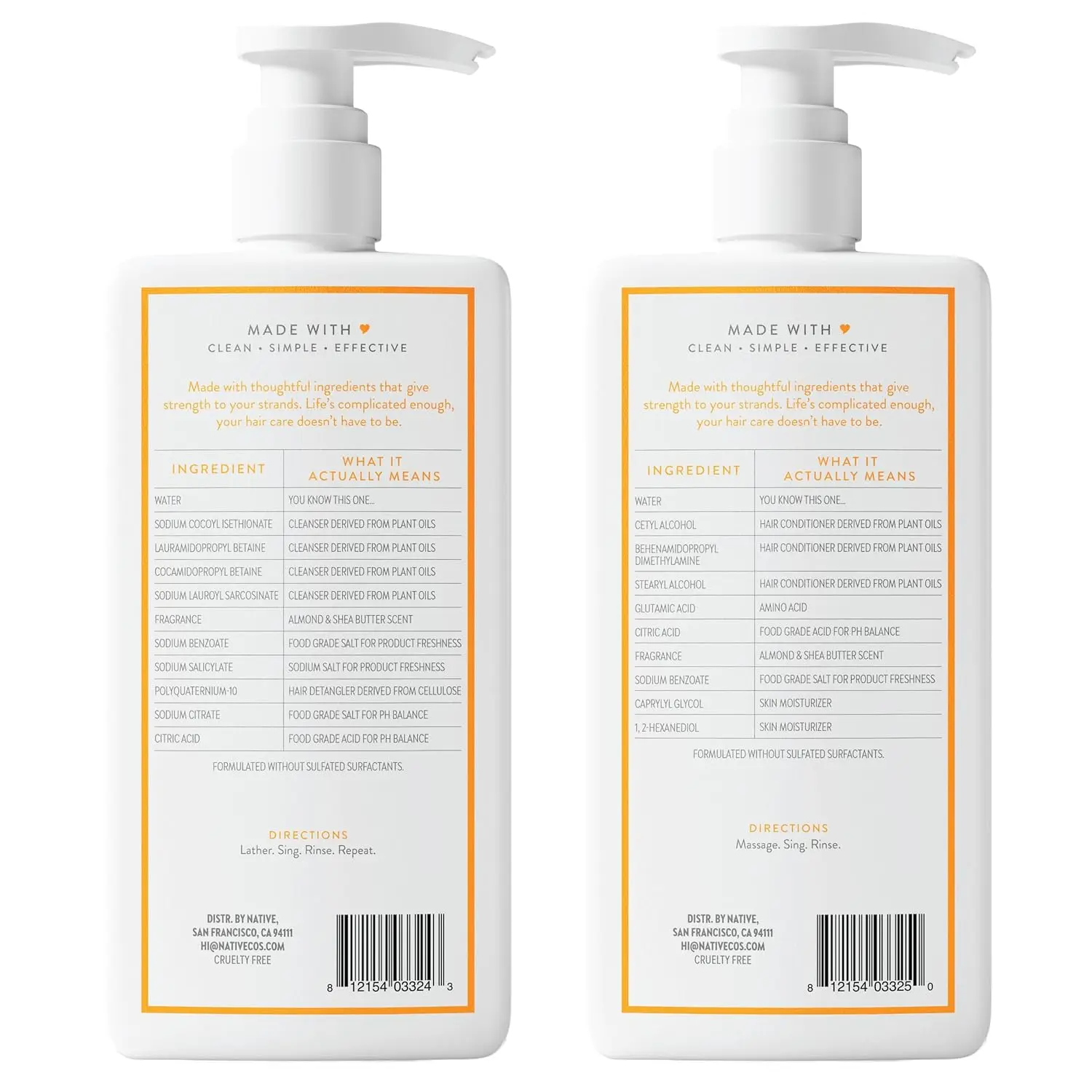·Naturally Derived Ingredients - Native shampoo and conditioner set contains naturally derived and simple ingredients. Made with just 10 thoughtful ingredients that give strength to your strands such as coconut oil derived cleansers, food grade cleansing salts, and citric acid for pH balance. Free of silicone, sulfated surfactants, paraben, and dyes.