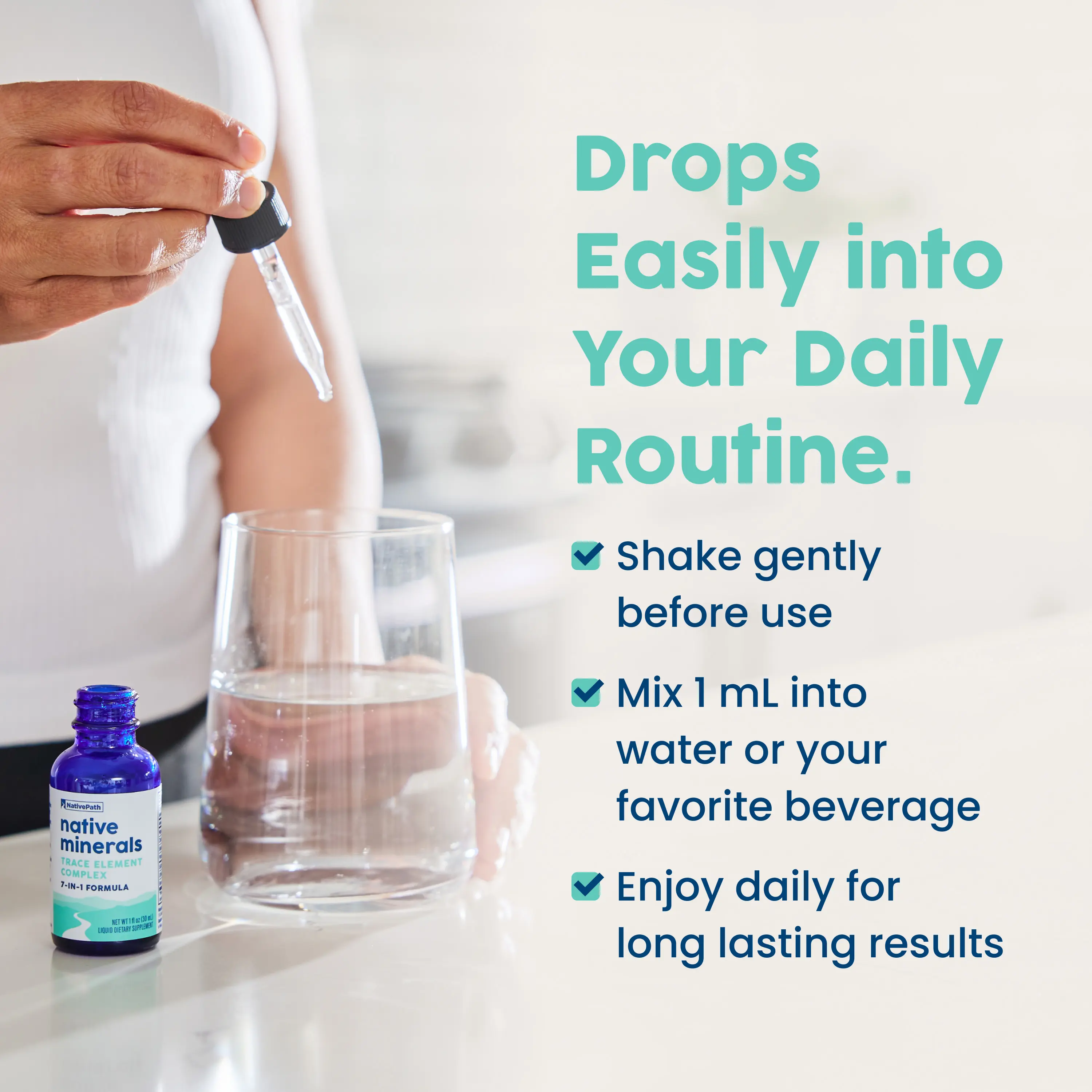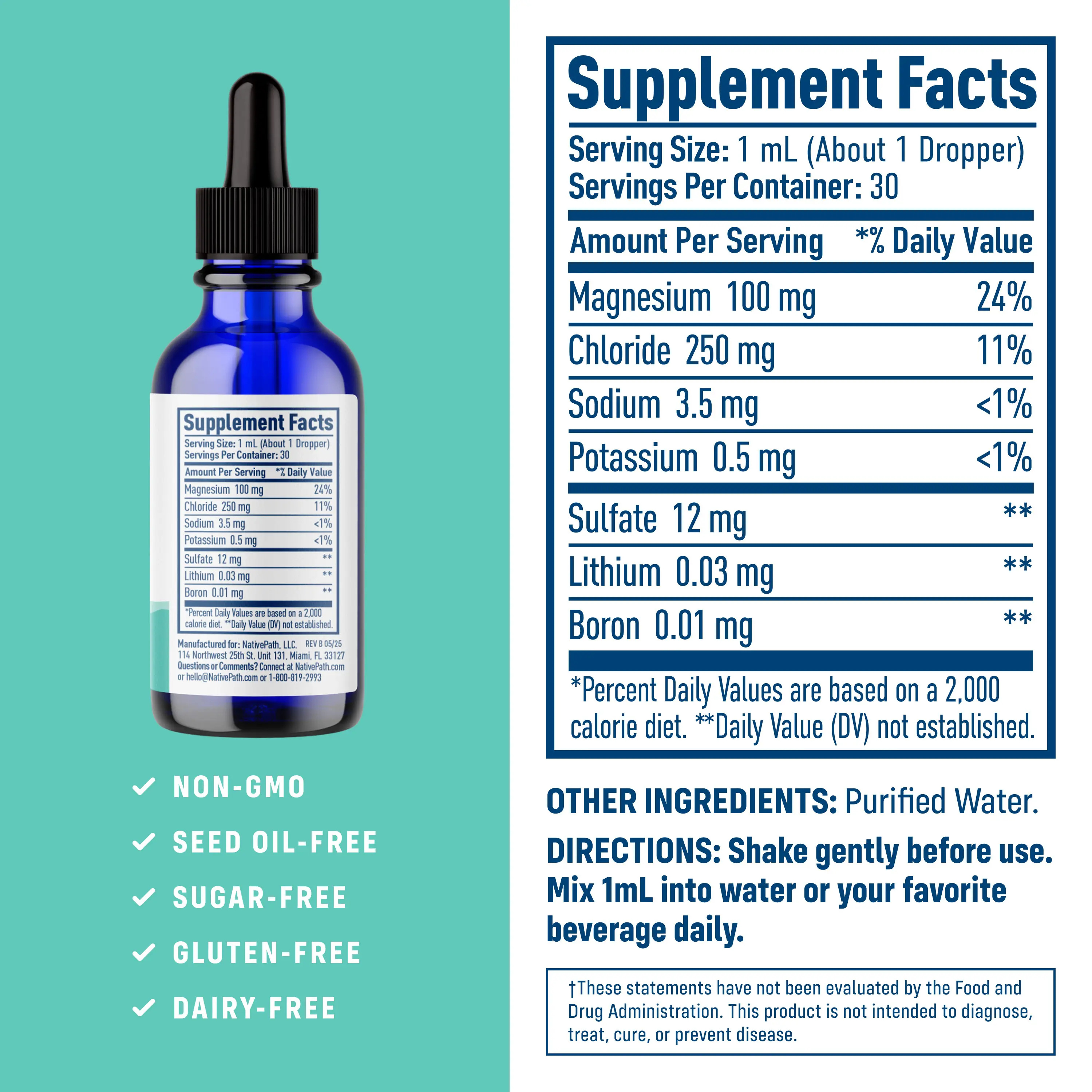 NativePath Native Minerals delivers 7 naturally occurring minerals in their most bioavailable form, sourced directly from Utah's Great Salt Lake. Each batch undergoes a meticulous two-year solar evaporation process, ensuring exceptional purity while preserving the natural elements your body needs for optimal function and vitality. Shake gently before use. Mix 1mL into water or your favorite beverage daily. Each bottle contains 30 servings of premium immune support and is third-party tested and manufactured in a cGMP-certified facility in the United States.