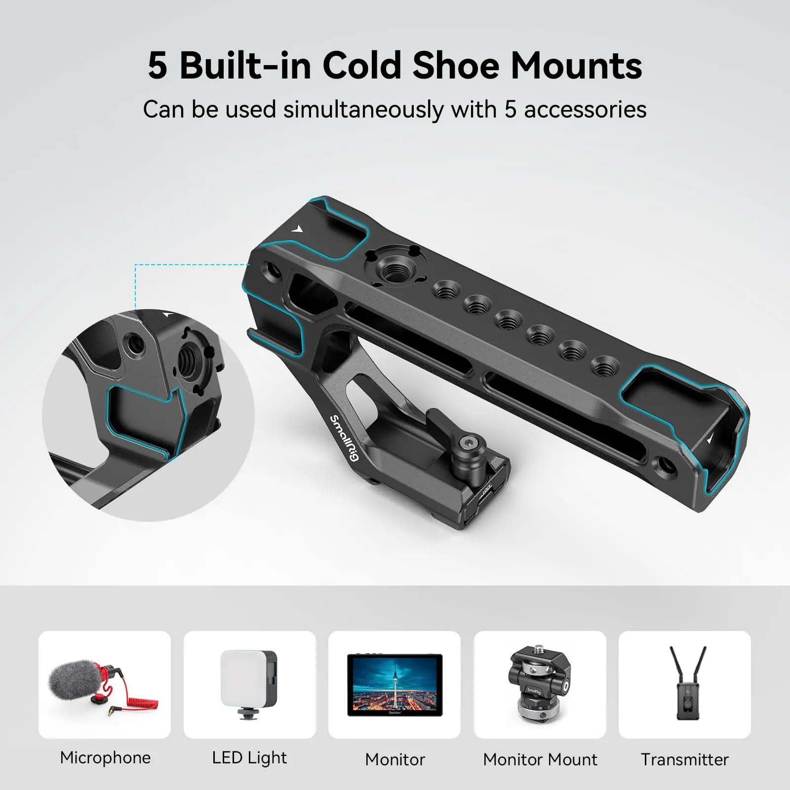 ·5 Built-in Cold Shoe Mounts: The front of the handle has 3 cold shoe mounts, while the back end has 2, allowing for connection of up to 5 external devices simultaneously, such as LED light, monitor, microphone, transmitter, and more.