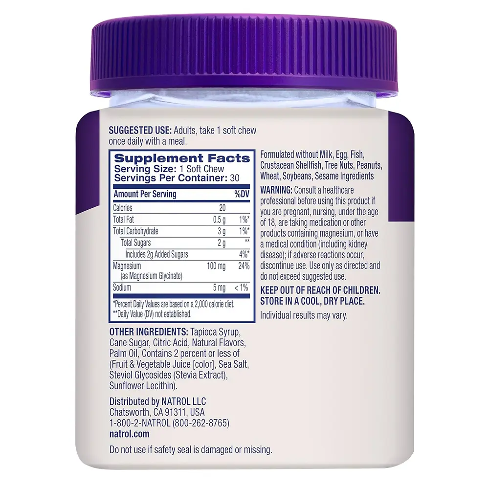 Natrol Magnesium Glycinate soft chews for adults are crafted to support your overall wellbeing.(1) These magnesium gummy soft chews provide 100mg high absorption magnesium glycinate in each cherry lemon chew, making them a great choice for adults seeking a magnesium supplement for sleep.(1) Magnesium is a nutrient that plays a vital role in numerous functions throughout the body, including muscle relaxation and promoting restful sleep.(1) These magnesium glycinate gummy supplements are gentle on your stomach, making them a great supplement to incorporate into your routine. Enjoy the tasty convenience of these individually wrapped magnesium glycinate chews. As sleep gummies for adults help with relaxation and support a restful night's sleep.(1) Whether you're looking for magnesium gummies to help relax after a long day, or to maintain muscle function and overall health, these chews deliver both quality and taste.(1) Natrol's magnesium soft chews offer a convenient, chewable form with these Magnesium glycinate gummies for adults. (1)These statements have not been evaluated by the Food and drug administration. This product is not intended to diagnose, treat, cure or prevent any disease. (2)Nielsen, xAOC, 52 weeks ending 1/25/25, Sleep Aid Supplements.