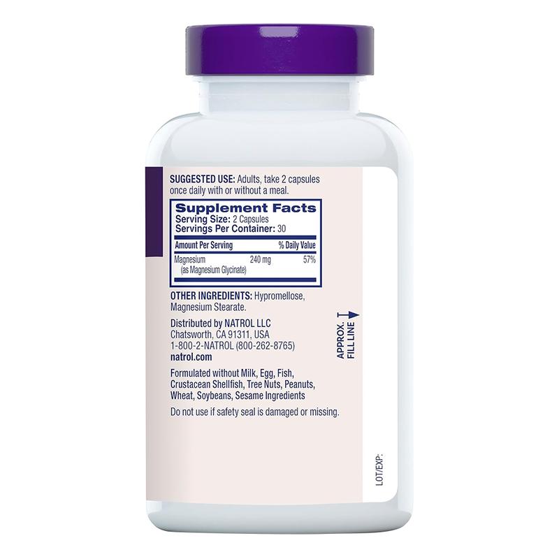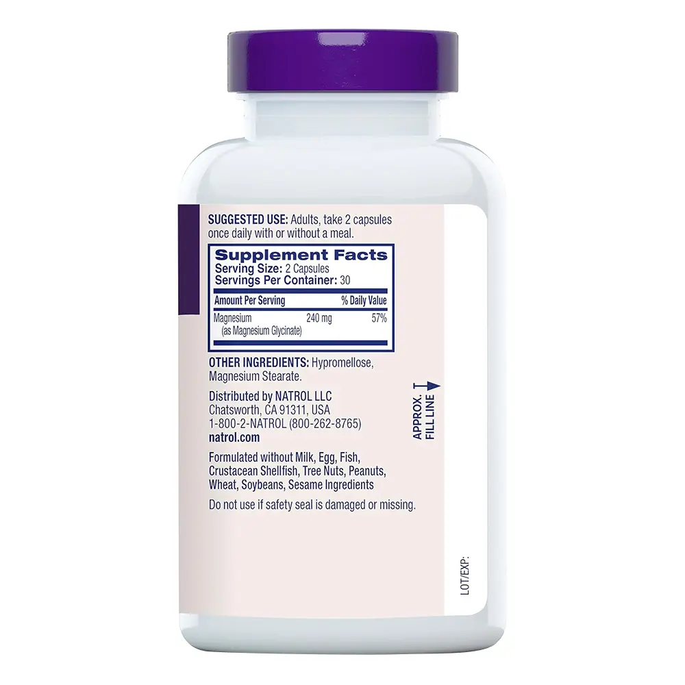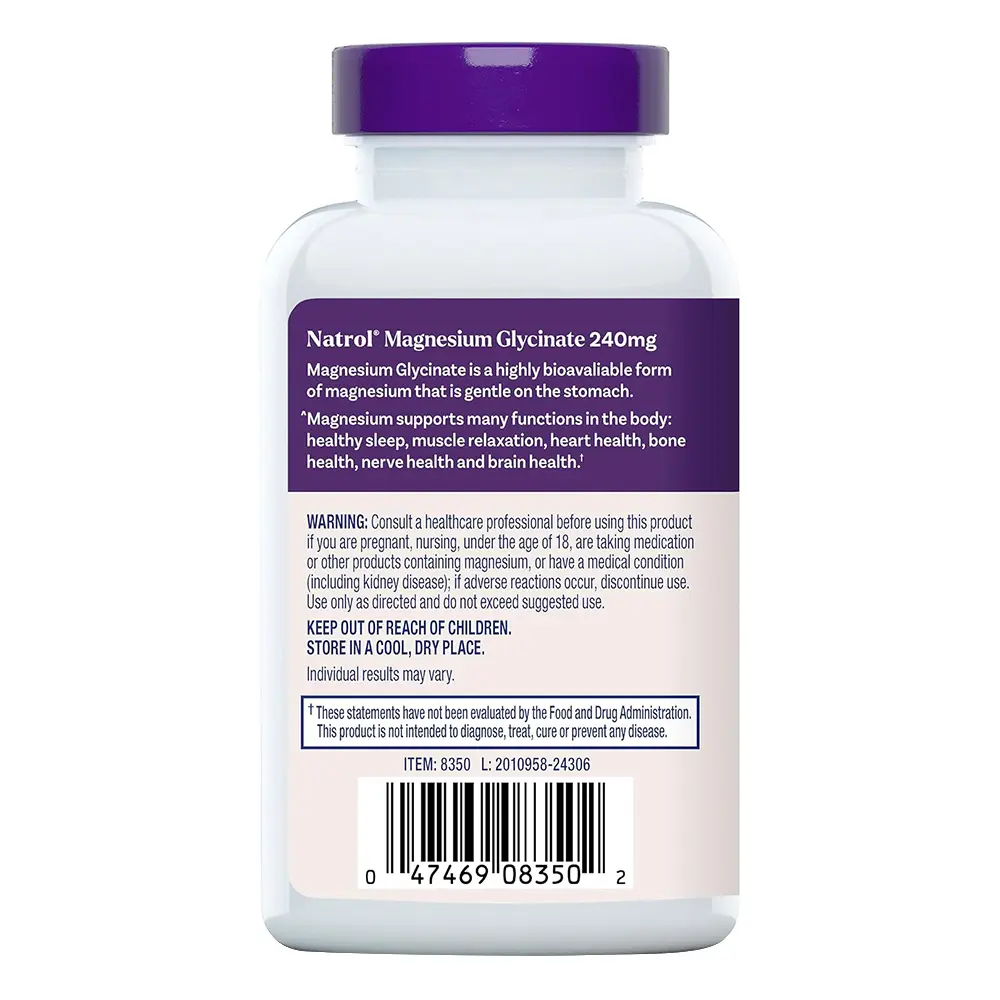 Natrol High Absorption Magnesium Glycinate 240 mg helps support healthy sleep and a healthy body.(1) Magnesium Glycinate is a highly bioavailable form of magnesium that is gentle on the stomach.(1) Magnesium-glycinate supports many functions in the body: healthy sleep, muscle relaxation, heart health, bone health, nerve health and brain health(1). These magnesium glycinate capsules contains no milk, egg, fish, crustacean shellfish, tree nuts, peanuts, wheat, soybeans or sesame. Use this magnesium supplement for sleep and general health.(1) Suggested Use: Adults, take two magnesium caps once a day with a meal. For those exploring alternatives, consider our magnesium glycinate powder for sleep or enjoy the convenience of magnesium glycinate gummy formulations. Elevate your health and wellness with Natrol Magnesium Glycinate, a great addition to your modern lifestyle. (1)These statements have not been evaluated by the Food and drug administration. This product is not intended to diagnose, treat, cure or prevent any disease. (2)Nielsen, xAOC, 52 weeks ending 3/29/25, Sleep Aid Supplements