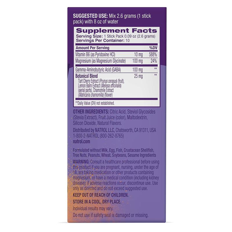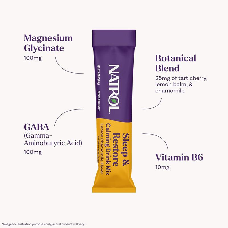 Experience a restful night's sleep with Natrol Sleep + Restore Sleep supplement. This melatonin-free sleep magnesium glycinate supplement is specially formulated and essential to your ultimate restorative sleep.(1) Each packet includes 100mg of magnesium glycinate and 100 mg GABA, plus 10mg of B6. Ideal for use as a magnesium sleep aid, this magnesium glycinate powder for sleep also features a botanical blend with 25mg of Tart Cherry, Lemon Balm, and Chamomile. In convenient magnesium powder packets, this product makes it easy to prepare your nightly magnesium powder calming drink. Simply add one stick to 8oz of hot or cold water, and enjoy the delightful lemon chamomile flavor as you prepare for a tranquil night's rest. This sleep magnesium powder is also sugar-free and sweetened with stevia. Natrol Sleep + Restore is dedicated to providing a magnesium drink that is 100% drug-free and non-habit forming. (1) These statements have not been evaluated by the Food and Drug Administration. These products are not intended to diagnose, treat, cure, or prevent any disease. (2) Nielsen, xAOC, 52 weeks ending 1/25/25, Sleep Aid Supplements