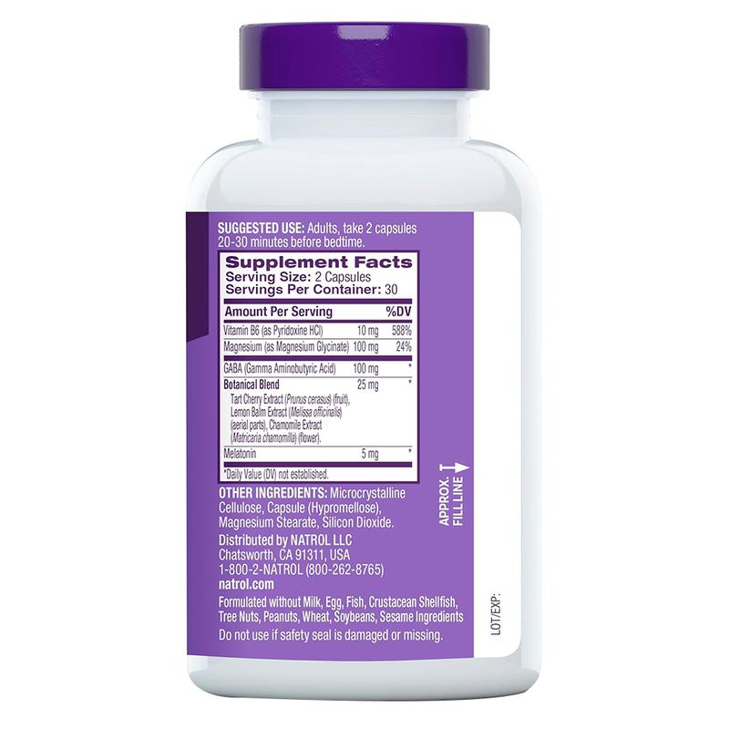Experience restorative sleep with our Natrol Sleep + Restore Capsules, formulated to provide a complete nighttime sleep aid supplement. This magnesium supplement for sleep combines magnesium-glycinate and GABA calm to support your sleep quality.(1) Featuring 100mg of blended magnesium glycinate supplements per serving, it acts as a magnesium glycinate sleep support and helps with relaxation.(1) In addition to magnesium for sleep, each capsule also offers the benefits of melatonin 5 mg, a well-known 100% drug-free and non habit-forming sleep aid that assists you in falling asleep faster and staying asleep longer.(1) Formulated with magnesium glycinate 100mg, 5 mg melatonin, 100mg GABA, and 10mg B6 to deliver an overall magnesium sleep supplement. Our blend includes a selection of botanicals such as Tart Cherry, Lemon Balm, and Chamomile. Ideal for those seeking sleeping aids for adults. Support your nighttime routine with this comprehensive sleep supplement—our capsules are vegetarian, non-GMO, and free from artificial flavors and sweeteners. Whether you prefer magnesium powder for sleep or seek a capsule form, Natrol, the #1 drug-free sleep aid brand delivers these magnesium glycinate sleep aids with effective results for better sleep quality.(1) (1) These statements have not been evaluated by the Food and Drug Administration. These products are not intended to diagnose, treat, cure, or prevent any disease. (2) Nielsen, xAOC, 52 weeks ending 1/25/25, Sleep Aid Supplements.