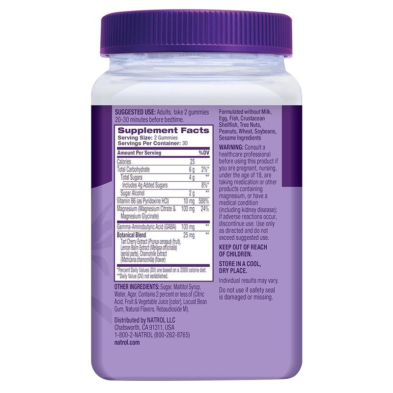Botanical Blend: Tart Cherry Extract (Prunus Cerasus) (Fruit), Lemon Balm Extract (Melissa Officinalis) (Aerial Parts), Chamomile Extract (Matricaria Chamomilla) (Flower). Other Ingredients: Maltitol Syrup, Cane Sugar, Water, Agar, Contains 2 Percent or Less of (Citric Acid, Fruit & Vegetable Juice [Color], Locust Bean Gum, Natural Flavors, Rebaudioside M).
