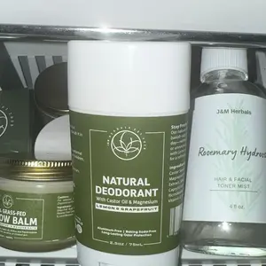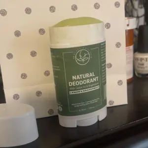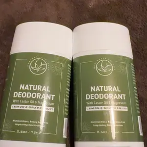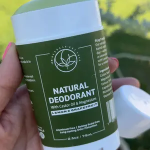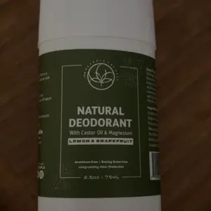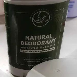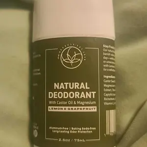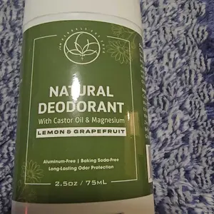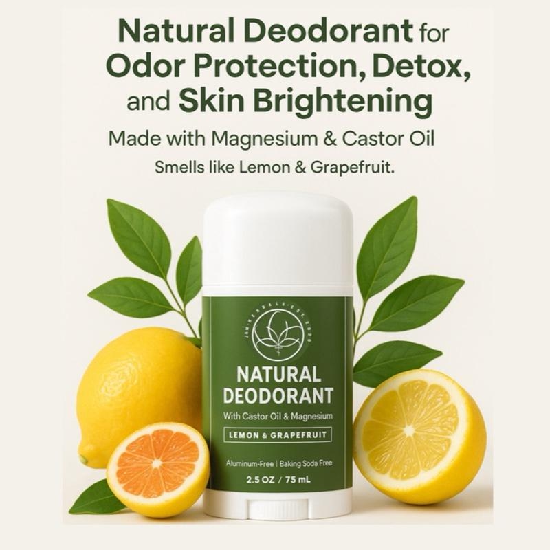 ·The product image features a natural deodorant stick with lemon and grapefruit imagery, emphasizing the citrus scent and natural ingredients.