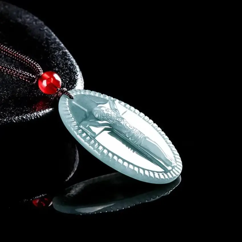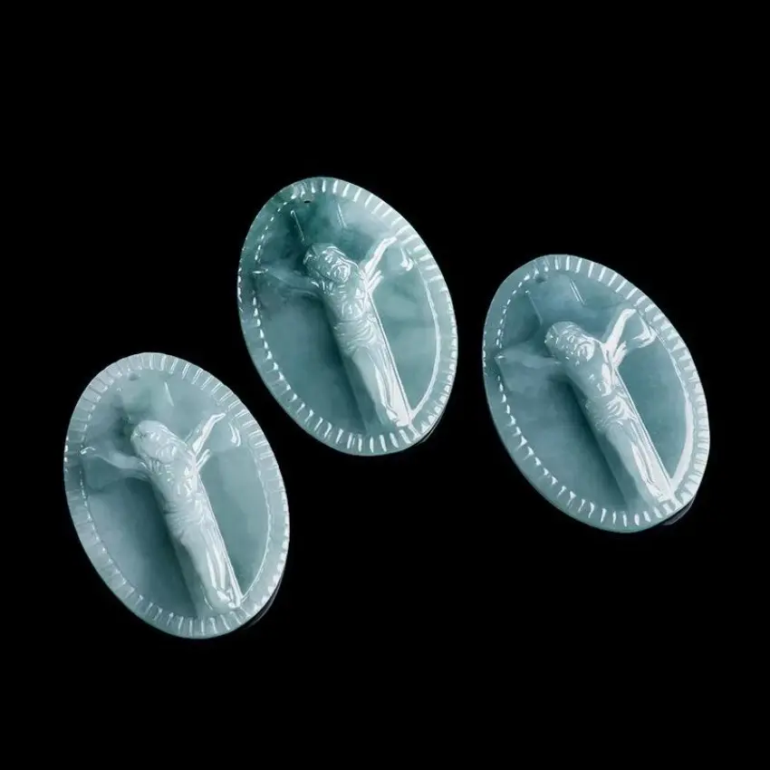 Product: Jade Jesus Crucifix Pendant Dual Symbolism: It serves as a Christian spiritual accessory, while jade (a tradition-revered gem) adds the auspicious meaning of attracting wealth & prosperity — merging faith with fortune wishes. Material & Design: Crafted from light turquoise semi-translucent jade (jadeite-like texture), this oval pendant has a textured raised border. Its center features a detailed 3D carving of the Jesus crucifix (with clear clothing folds & contours), plus a top hole for necklace stringing. Smooth, luminous, and finely finished. Versatile Wear: Pairs seamlessly with necklaces (cord/metal chain) for daily use, religious occasions, or as a meaningful gift.