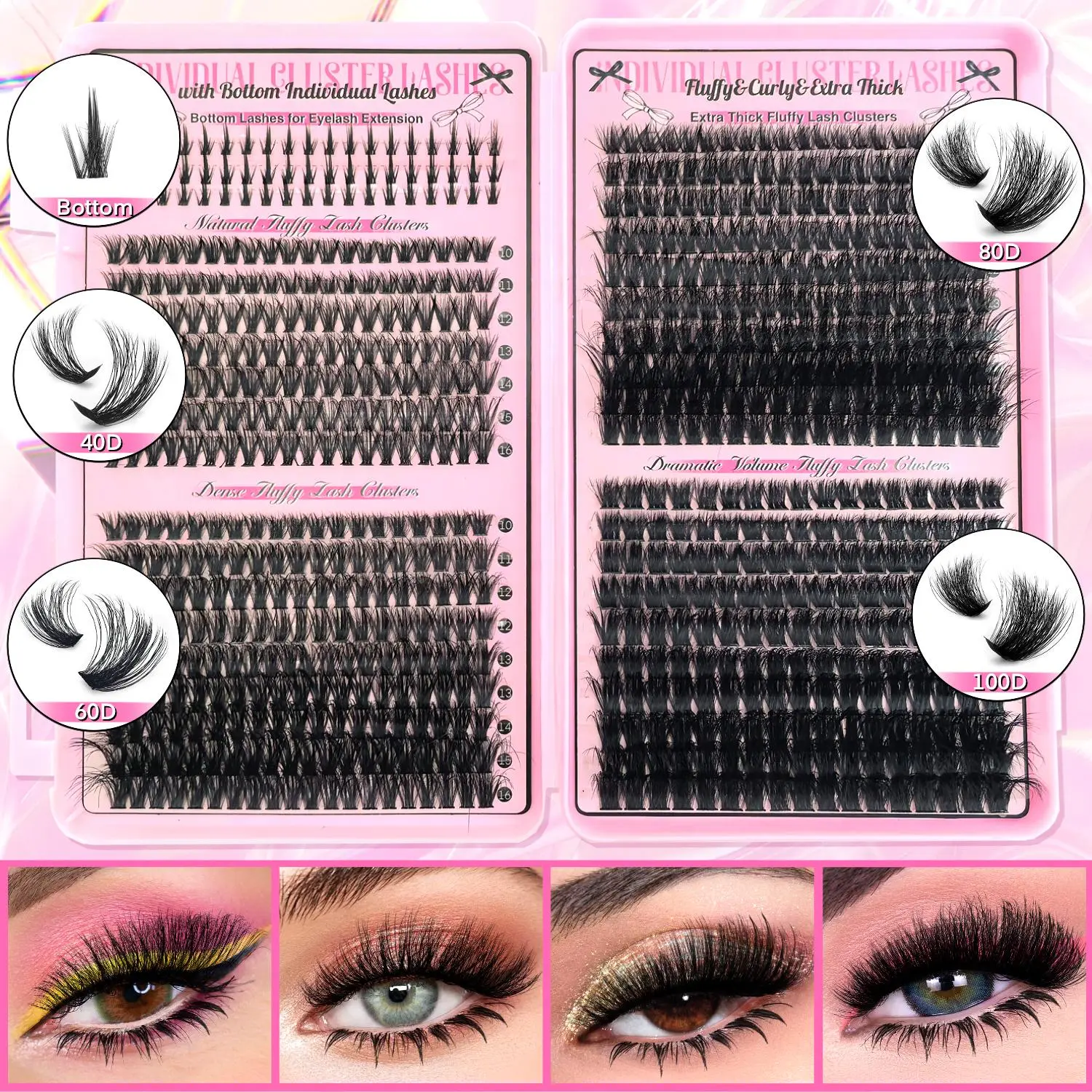 Lash Clusters Thick Eyelash Extension 60D+80D+100D Volume Cluster Eyelashes D Curl Cluster Eyelash Extension Wispy Individual Lashes Clusters 10-18mmwith Lash Bond and Seal, Lash Tweezers for Self Use
