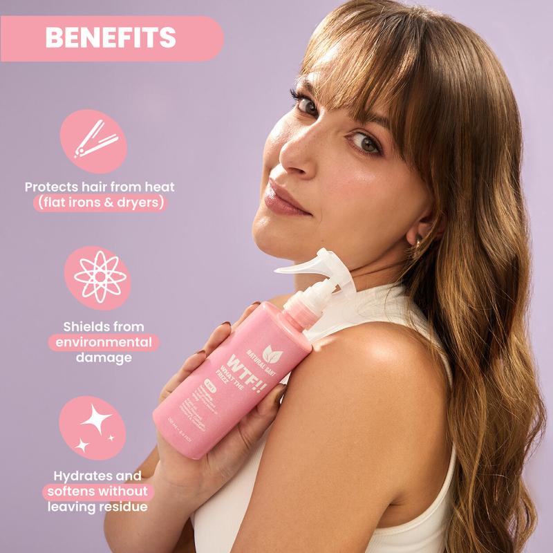 Say goodbye to frizz, dryness, and heat stress with What The Frizz by Natural Sant, a lightweight 3-in-1 spray designed to detangle, protect, and smooth hair in one easy step. Enriched with natural extracts of argan oil, onion, flaxseed, rosemary, biotin, and vitamins E & D, this non-greasy mist helps hydrate and soften hair while improving manageability and shine. Ideal for daily use on damp or dry hair, it leaves hair feeling silky, smooth, and naturally radiant without weighing it down.