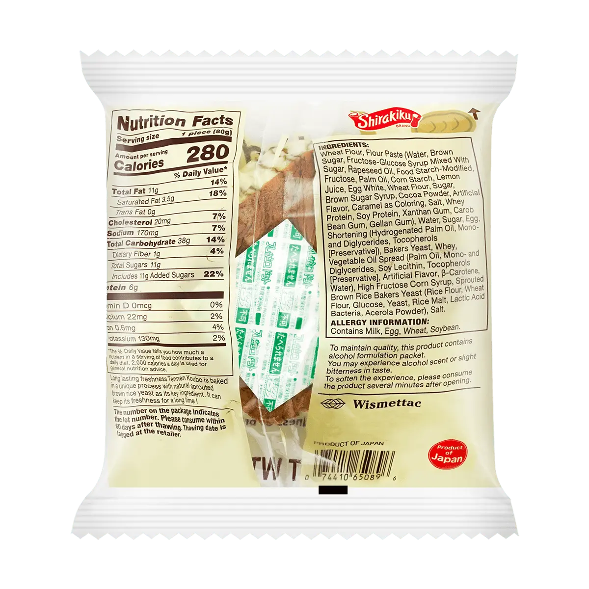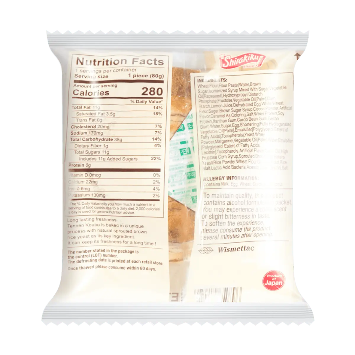 IngredientsWheat Flour, Flour Paste (Water, Brown Sugar, Isomerized Syrup Mixed With Sugar, Vegetable Oil (Raoeseed), Hydroxypropyl Distarch Phosphate, Fructose, Vegetable Oil (Palm),Corn Starch, Lemon Juice,Dehydrated Egg White, Wheat Flour, Sugar, Brown Sugar Syrup, Cocoa Powder, Artificial Flavor, Caramel As Coloring, Salt, Whey Protein, Soy Protein, Xanthan gum, Carob Bean Gum, Gellan Gum), Water, Sugar, Egg, Shortening (Fully Hydrogenated Vegetable Oil (Palm), Emulsifer (Polyglycerol Esters of Fatty Acids), Tocopheols), Yeast, Whey Powder, Margarine (Vegetable Oil (Palm), Water, Emulsifer (Polyglycerol Esters of Fatty Acids, Lecithin), Tocopherols, Artificial Flavor, Carrot Oil), High Fructose Corm Syrup, Sprouted Brown Rice Bakers Yeast (Rice Powder, Wheat Flour, Glucose, Yeast, Rice Malt Acid Bacteria, Acerola Juice, Dextrin), Salt.