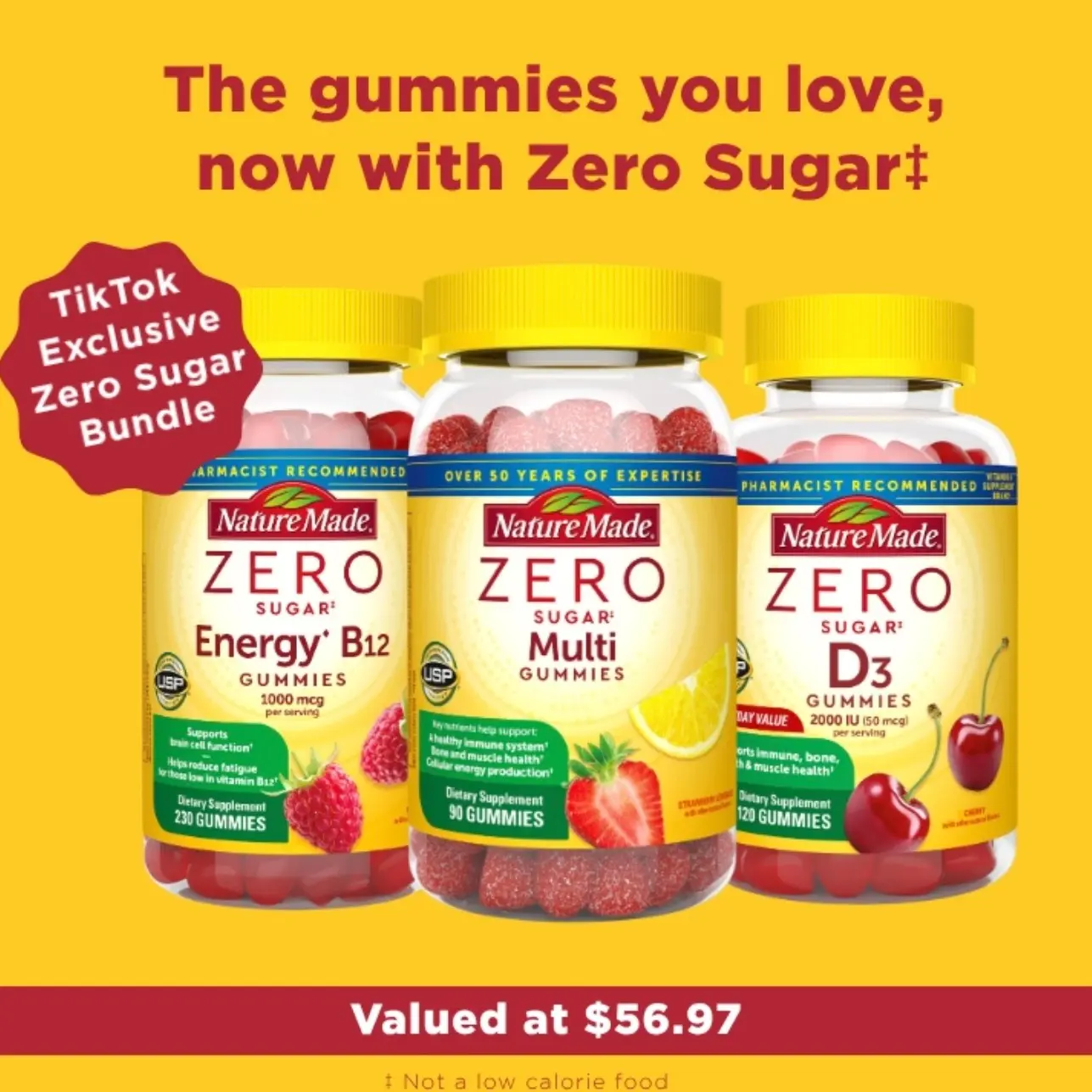 The Zero Sugar Bundle combines three of Nature Made’s most popular sugar-free gummies — delivering immune, bone, energy, and overall wellness support with no added sugar and no aspartame. Sweetened with maltitol, a sugar alcohol with the best GI tolerance among all sugar alcohols, these gummies make daily wellness simple, clean, and delicious.†
