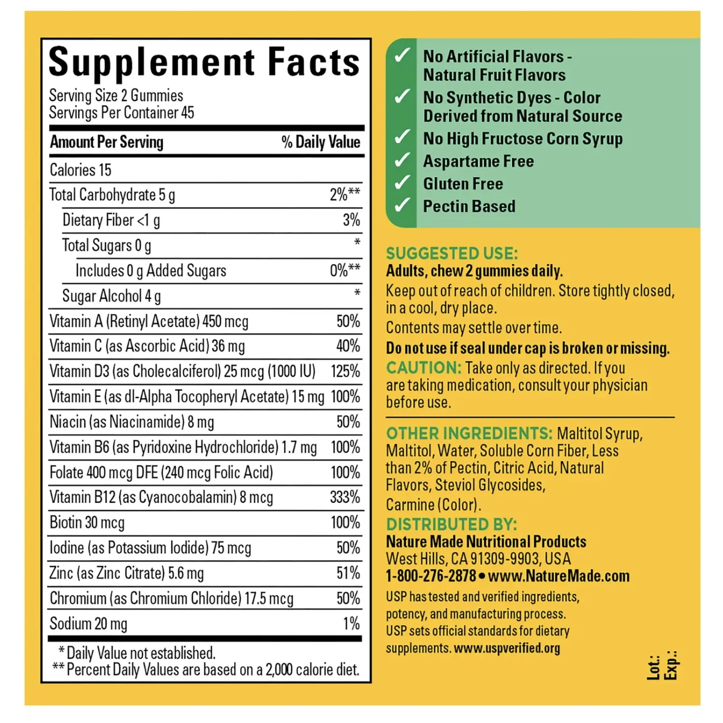 Nature Made Zero Sugar‡ Multivitamin Gummies deliver key nutrients to support a healthy immune system, bones, muscles, and energy metabolism. They also help maintain brain cell function — all in a strawberry lemonade flavor you’ll love.†