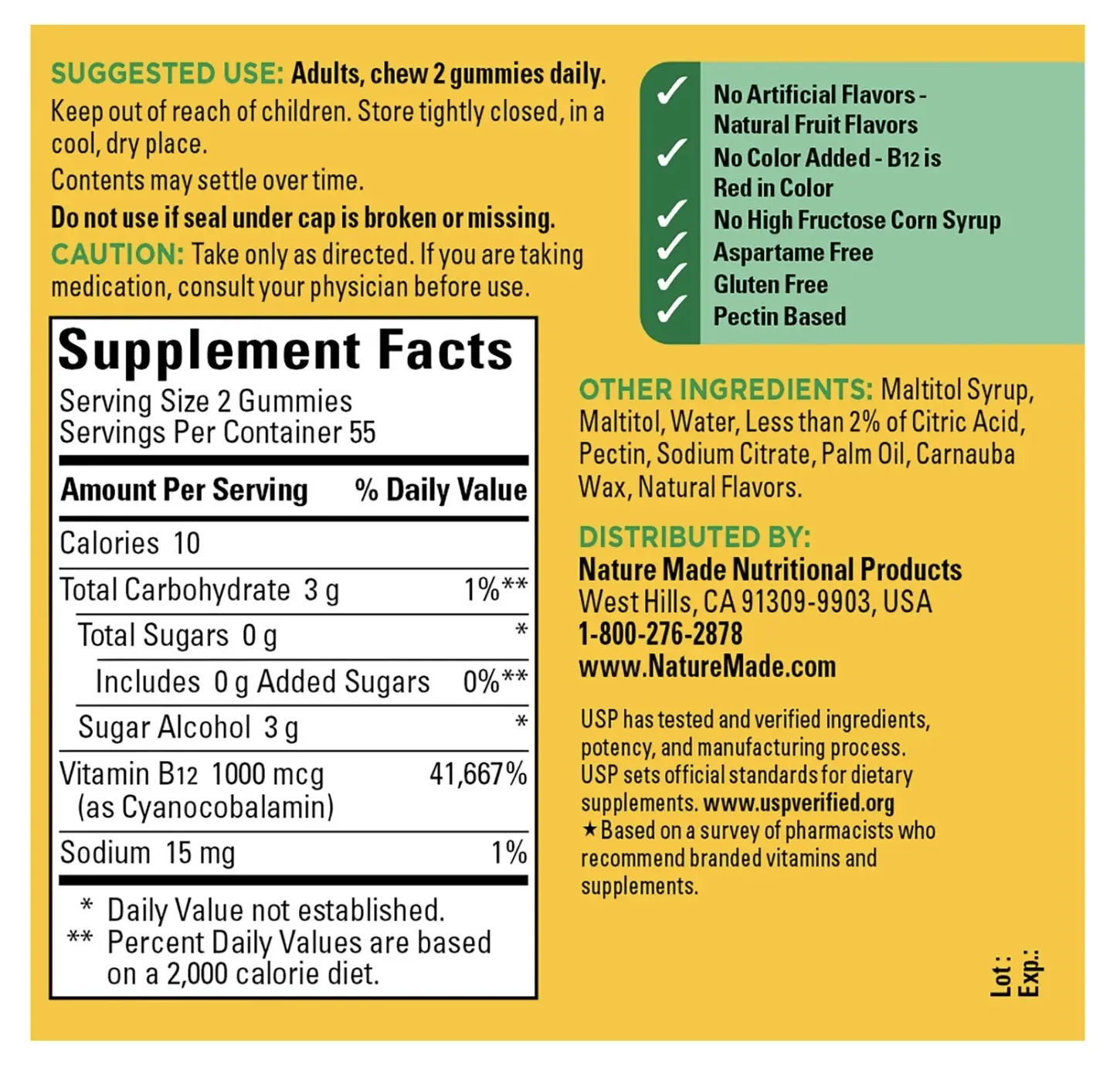 Each serving of Nature Made Zero Sugar‡ Energy◆ B12 Gummies provides 1000 mcg of Vitamin B12 to support energy metabolism, nervous system function, and mood health — all naturally flavored and aspartame free.†