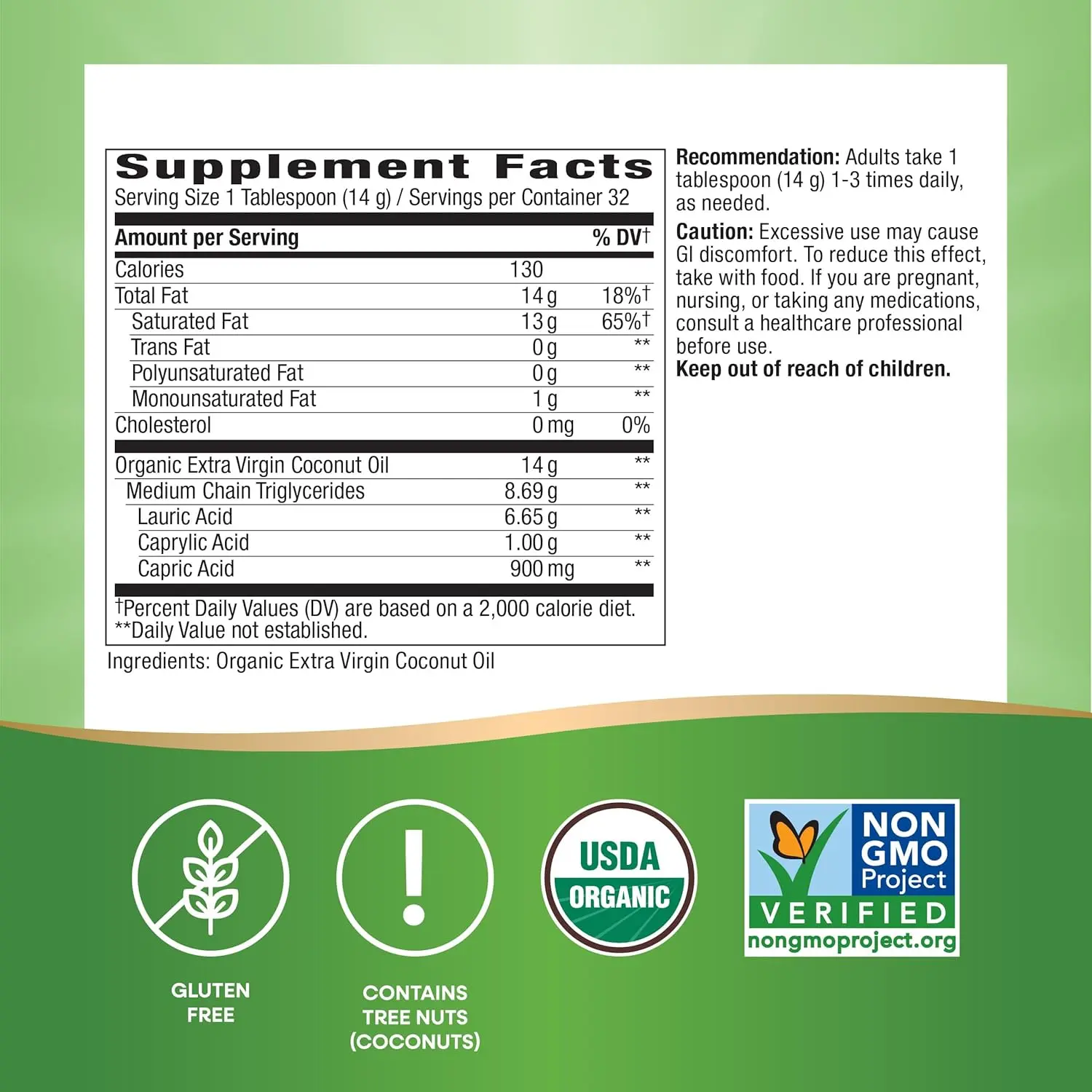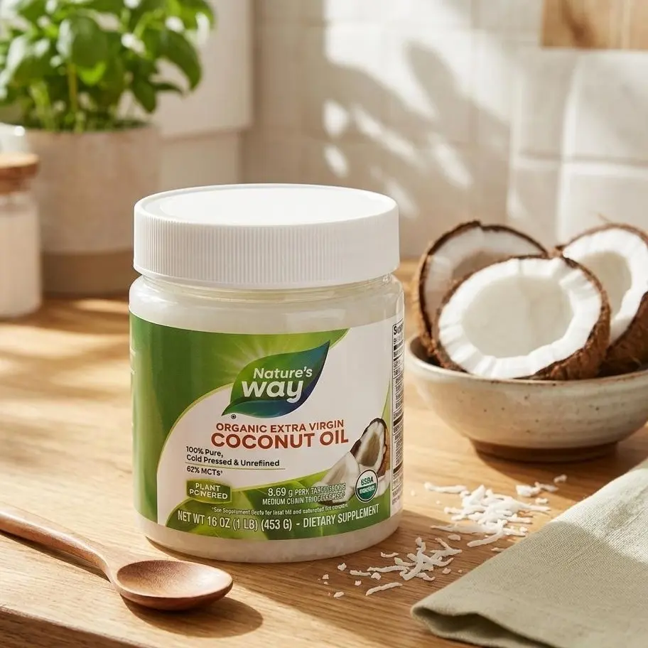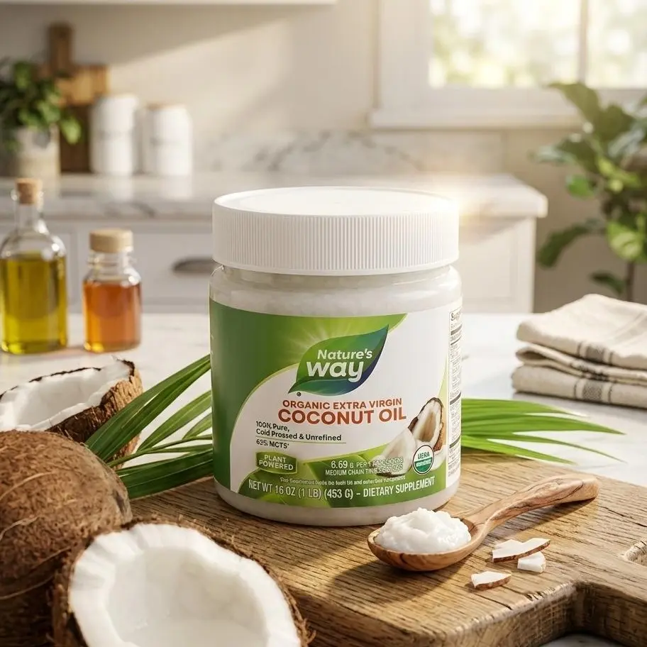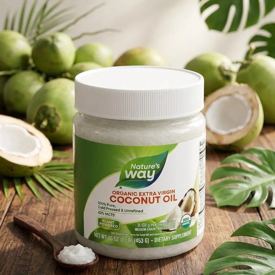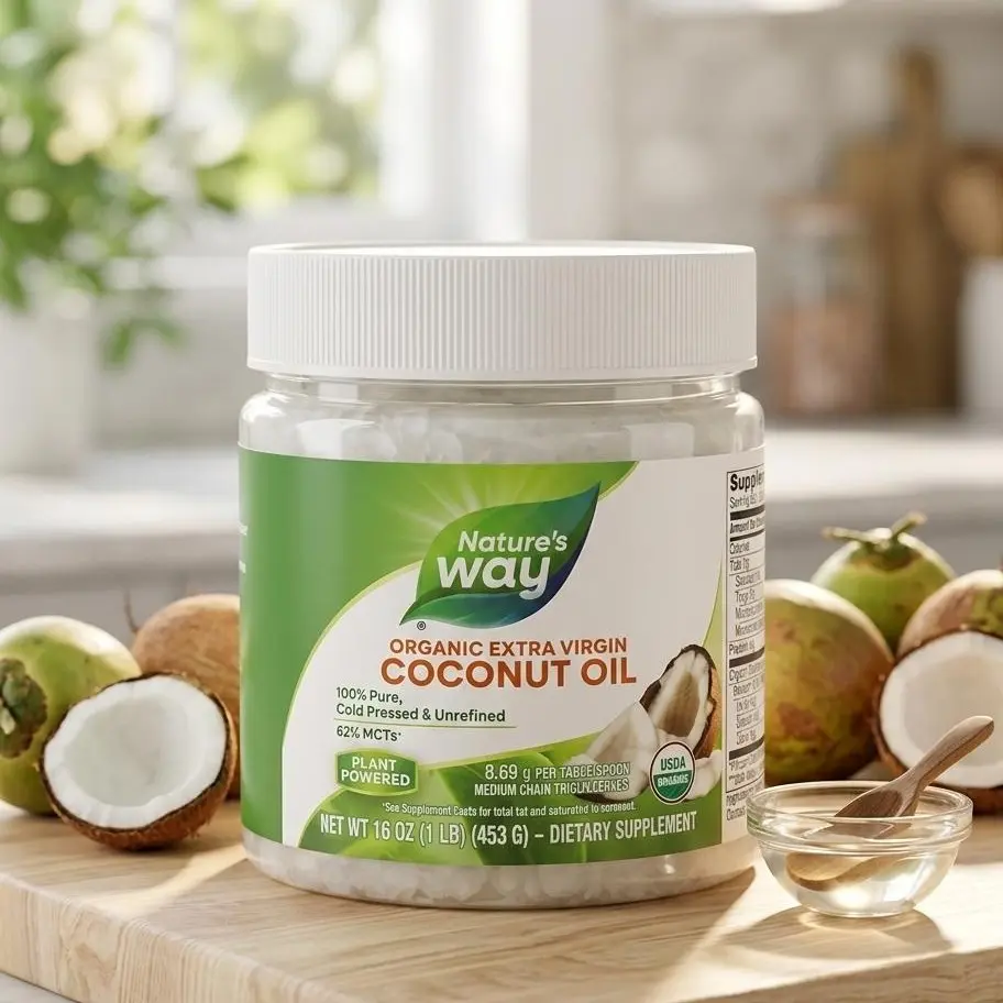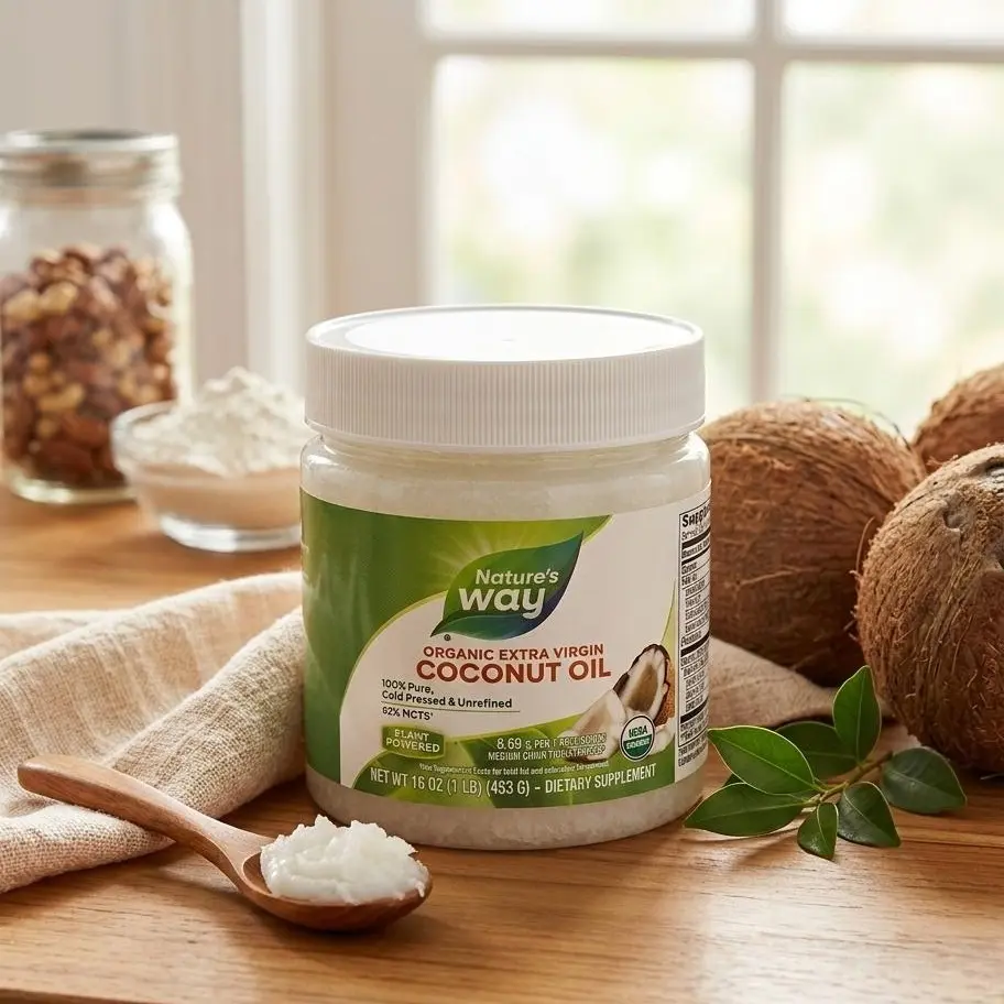 Nature's Way Extra Virgin Coconut Oil | 16 ozExperience one of the healthiest, most versatile superfoods on the planet. Nature's Way Extra Virgin Coconut Oil is cold-pressed from premium, non-GMO coconuts, ensuring you get the pure, unrefined nutrients of the fruit.Whether you're using it in the kitchen or as part of your beauty routine, this 16 oz jar offers a rich source of Medium Chain Triglycerides (MCTs)—specifically lauric acid—to fuel your body and nourish your skin.One Jar, Endless UsesIn the Kitchen: A stable, delicious alternative to butter or vegetable oils. With a smoke point of $350^\circ\text{F}$, it's perfect for sautéing, baking, or blending into your morning coffee.Skin & Hair Care: Acts as a luxurious natural moisturizer. Use it as a deep-conditioning hair mask, a gentle makeup remover, or a hydrating body oil.Energy Support: Contains 62% MCTs (9.3g per serving) which are easily digested and converted into energy by the body.