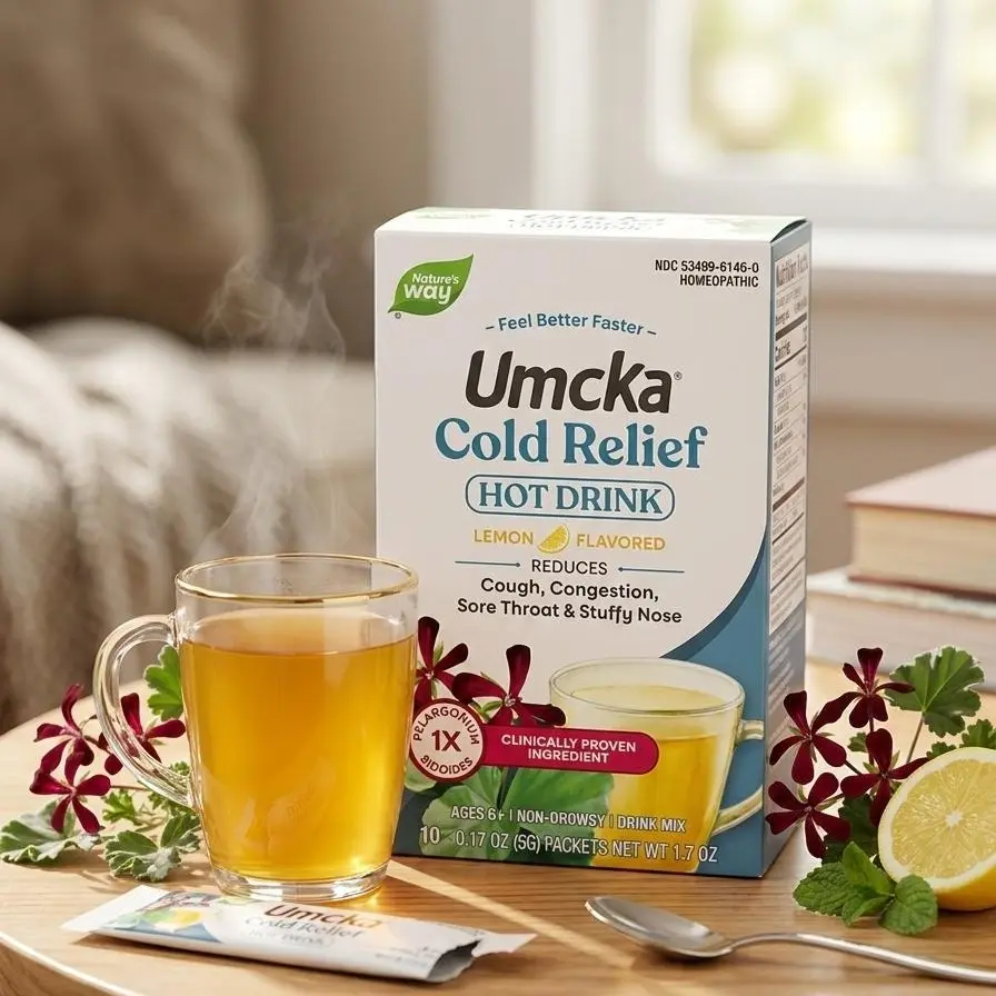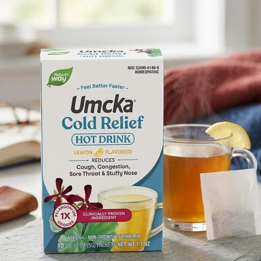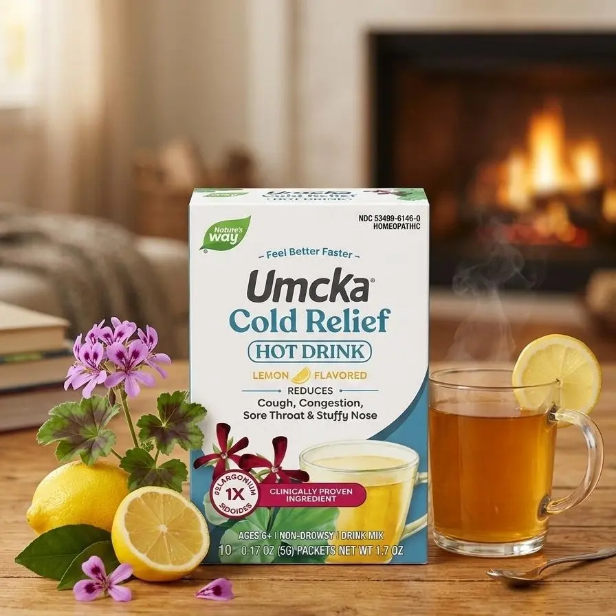 When you're feeling under the weather, sometimes a pill just isn't enough. Nature's Way Umcka ColdCare Lemon Hot Drink provides a warm, comforting way to tackle the symptoms of the common cold. This non-drowsy formula is powered by Pelargonium sidoides 1X—a medicinal South African plant extract clinically proven to reduce the severity of coughs, congestion, and sore throats.