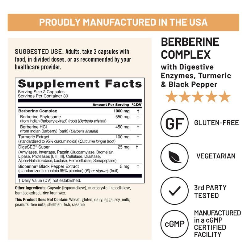 ·HIGH POTENCY 1000MG BERBERINE COMPLEX: This berberine supplement is formulated with 550mg of berberine phytosome and 450mg of berberine HCI, in addition to 100mg of turmeric extract, Bioperine Black Pepper Extract and DigeSEB Super enzymes.*