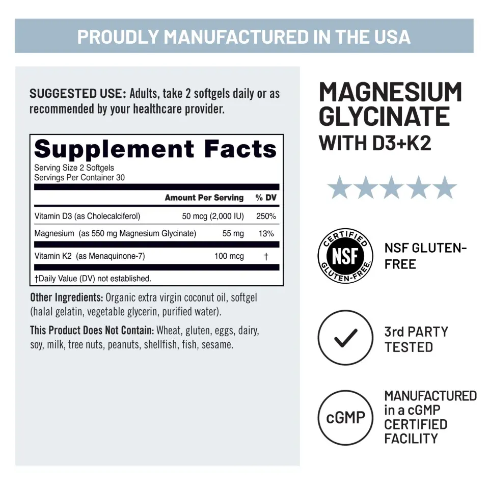 ·VITAMIN K2 100 MCG AS MK-7: This D3 K2 Magnesium Glycinate supplement has 100 mcg of vitamin K2 as MK-7 for bone and cardiovascular health support.*