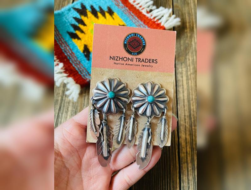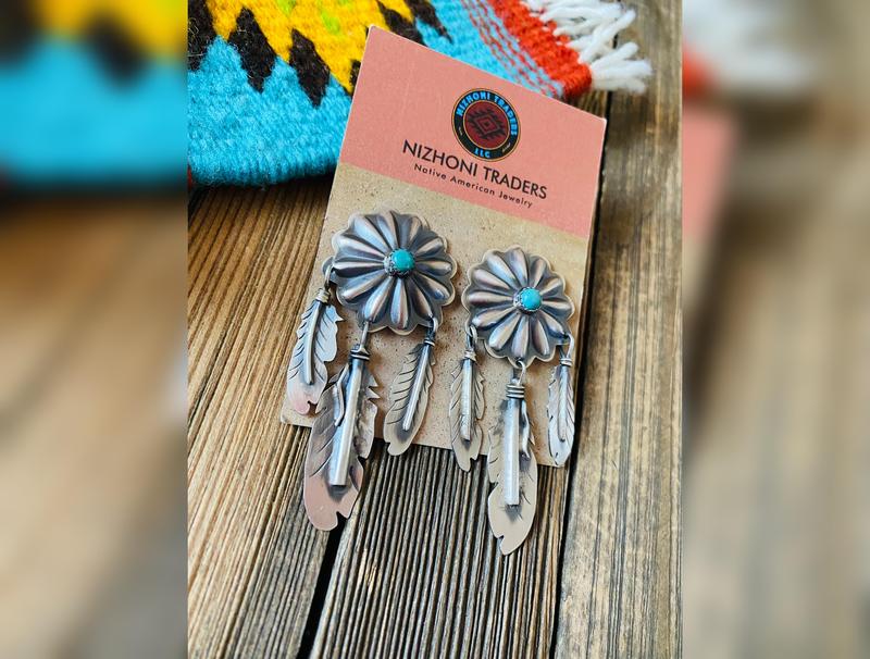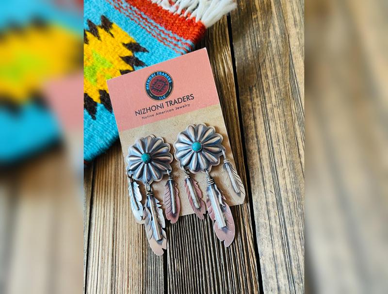5. Navajo Sterling Silver & Turquoise Concho Feather Dangle Earrings