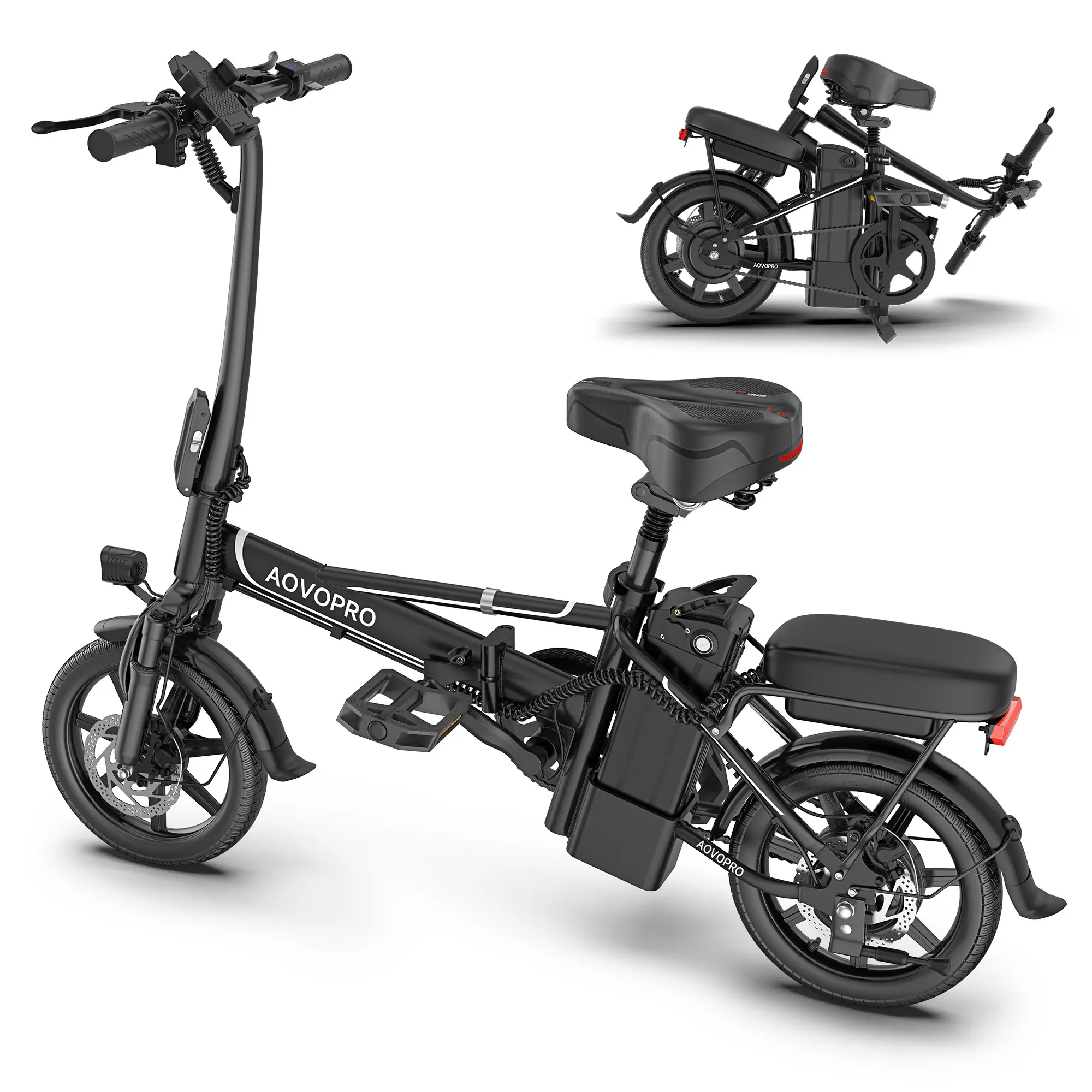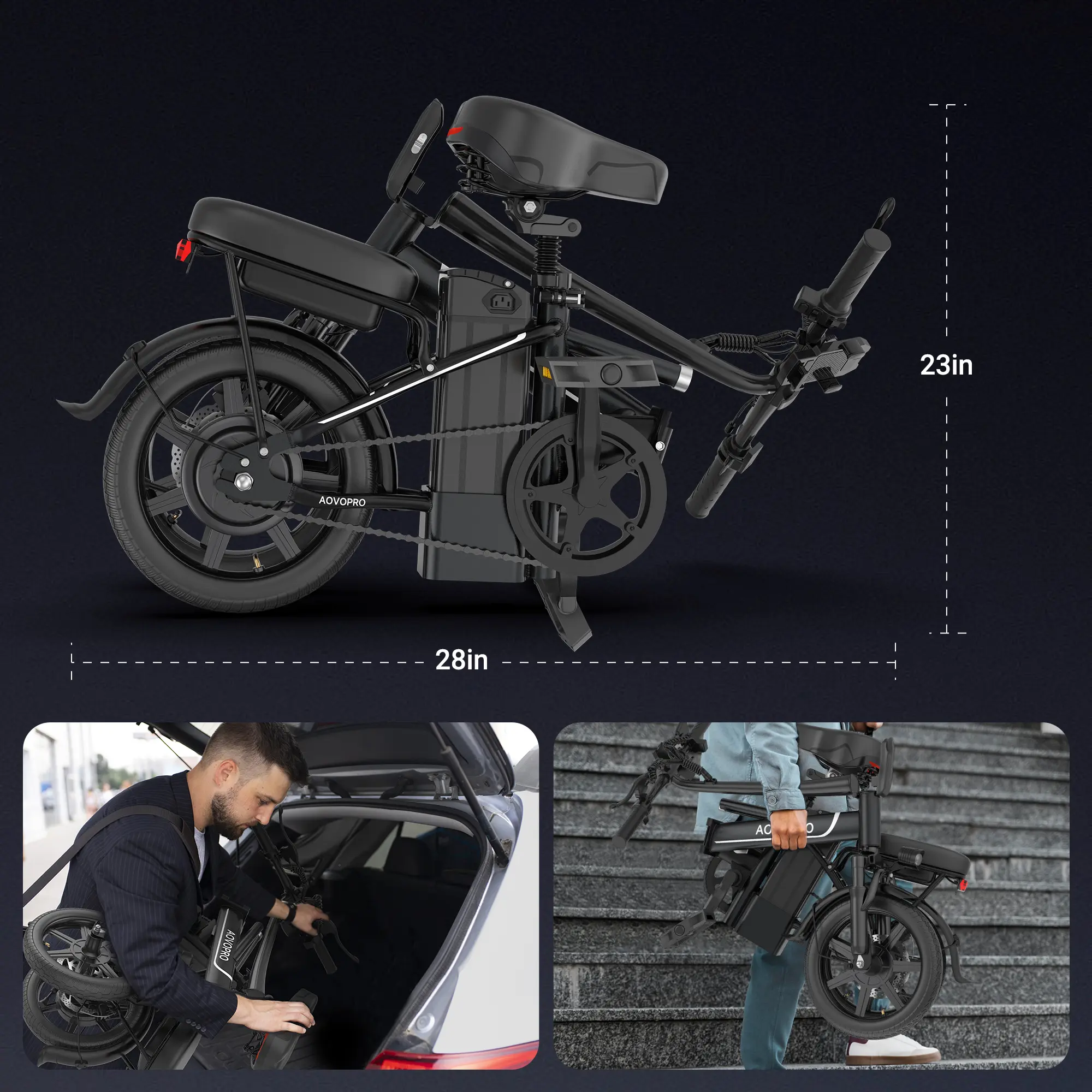 The bike is foldable, measuring 70 * 70 * 59 cm when folded and weighs only 22.7 kg. It is easy to transport and features a phone holder.