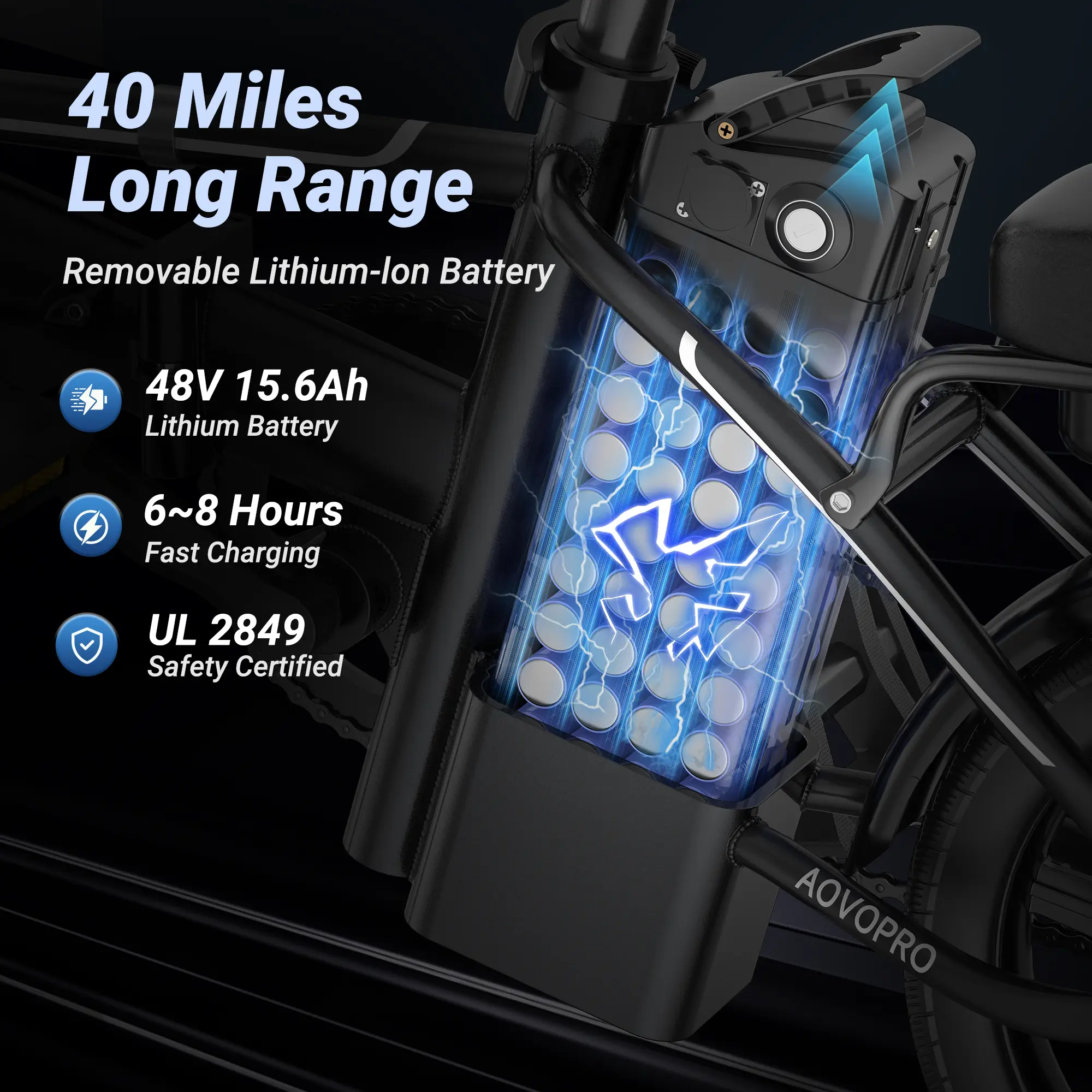 Equipped with a 48V-battery, this E-Bike offers a range of 22-40 miles. The 748W brushless motor enables a top speed of 22 MPH (after unlocking the speed limit).
