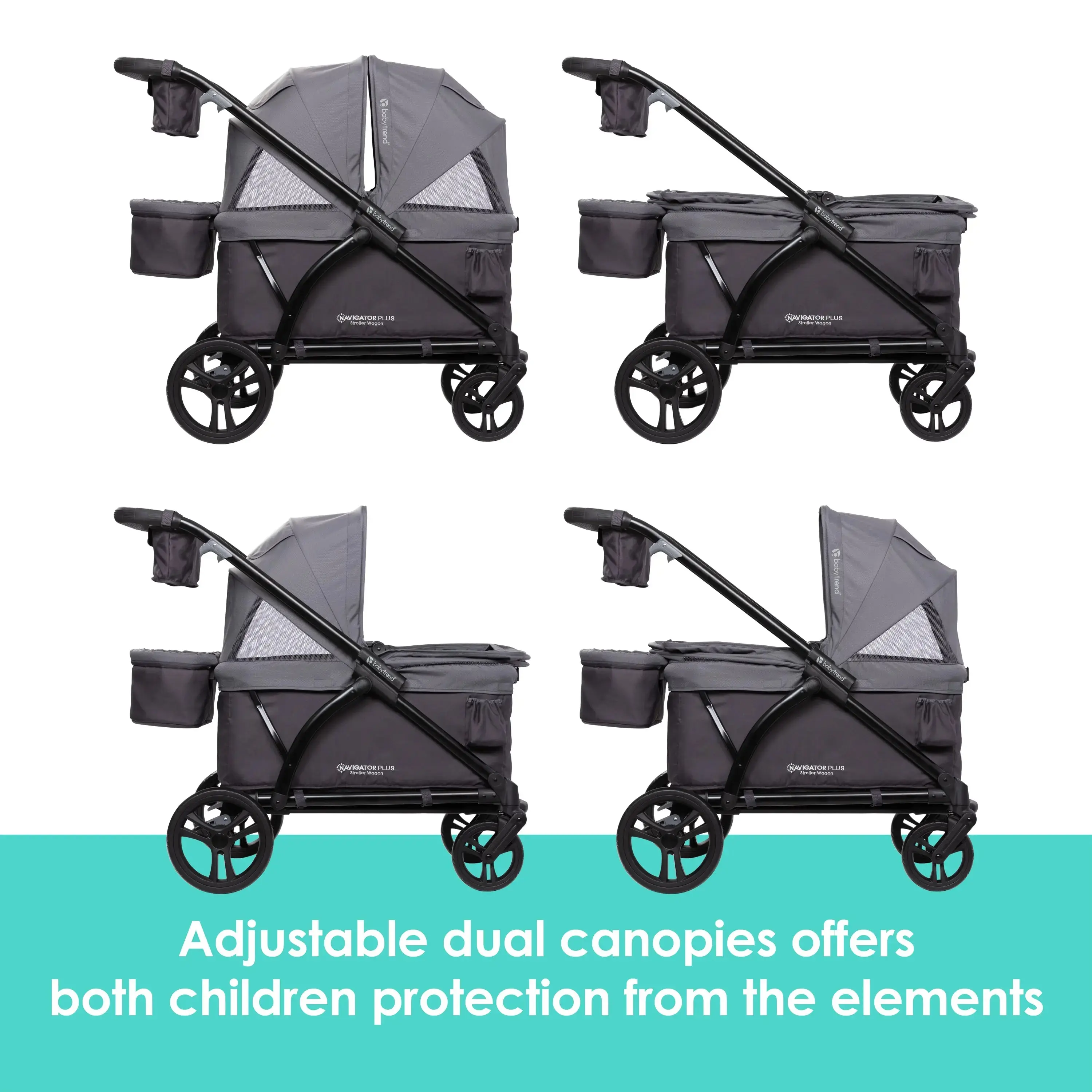 The Navigator® Plus 2-in-1 Stroller Wagon is the new and improved wagon option from Baby Trend® to fit your family's unique needs! The large cargo space offers built-in seating for two and includes two 3-point safety harness belts to keep your little ones secure. The dual canopies are independent and will shield both children from environmental stressors, such as the sun. Both canopies are adjustable and can be easily removed when not in use. The durable frame is dependable and will be a trusted addition to all family outings.