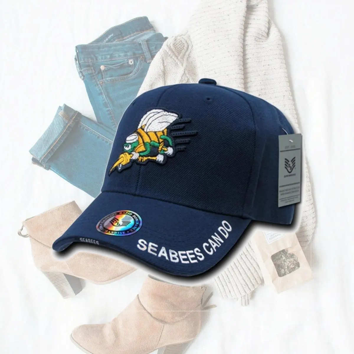 The Legend Military Branch cap is, as the name says, The legendary military cap line. This is a 6-Panel constructed cap that proudly displays our 3-D High Definition embroidery on the crown. The branch name is embroidered on both the edge of the sandwiched bill and on the top. An adjustable hook & loop strap with a woven logo provides the perfect fit. This cap is a great way to show your pride. Features 100% Acrylic.. Dog Tag Included.. Imported.. Imprint - Seabees.. Color - Navy.. Dimension - 8 x 8 x 7 in.. Item Weight - 0.3072 lbs..