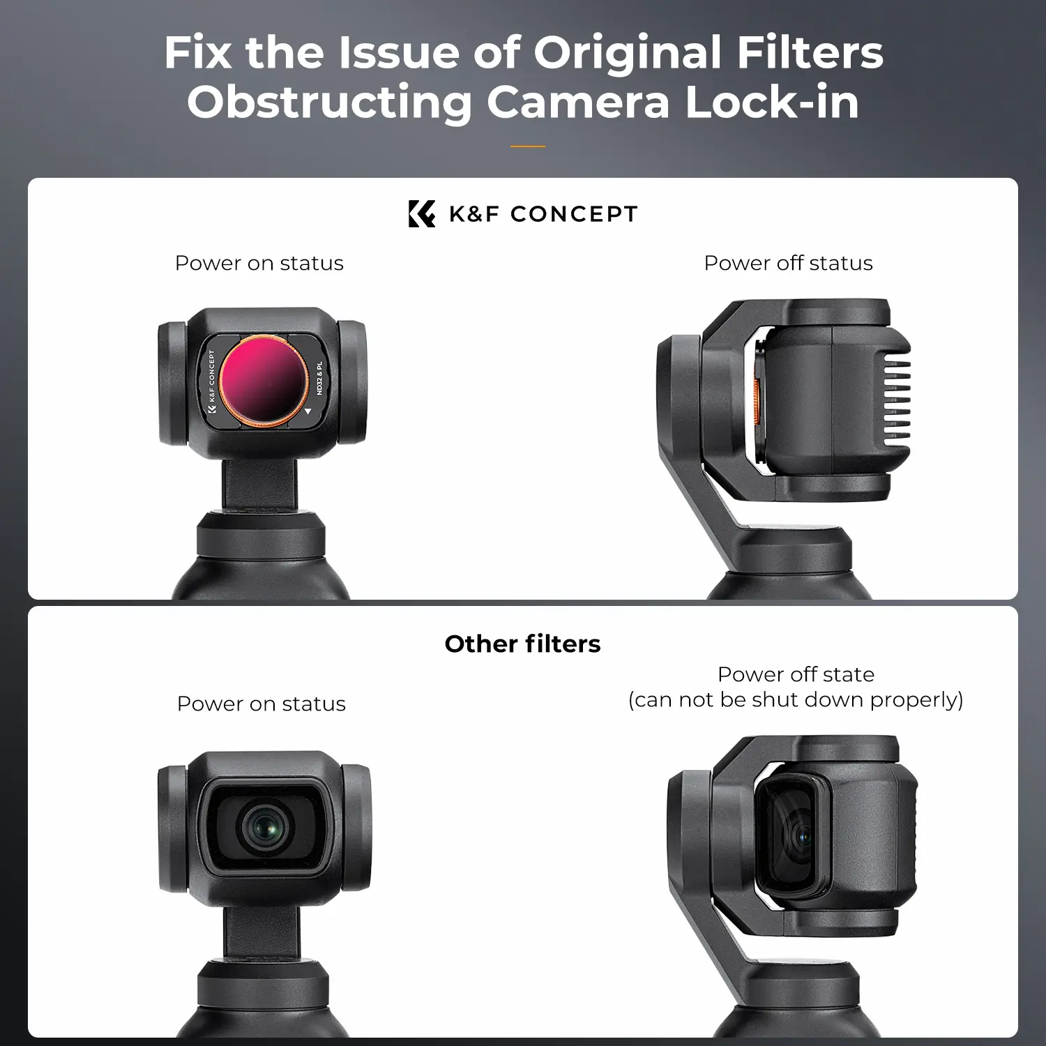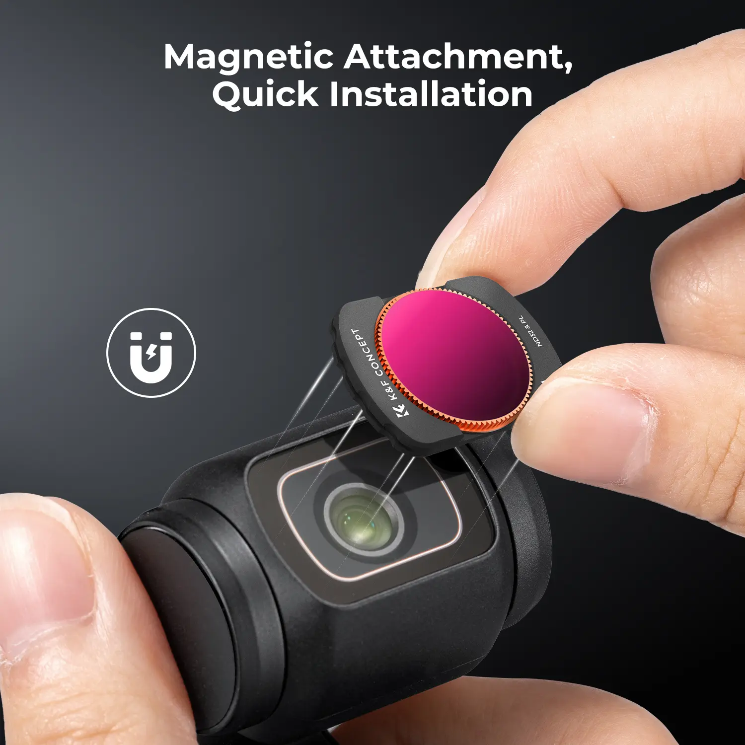 Ever struggled with glare or harsh sunlight while filming with your DJI Osmo Pocket 3? The K&F Concept Magnetic ND Polarized Filters Set is your new best friend. Designed specifically for the Osmo Pocket 3 Creator Combo, this 4-pack includes ND8/PL, ND16/PL, ND32/PL, and ND64/PL filters that help you control light exposure and reduce unwanted reflections from water or glass. Each filter is crafted from imported AGC optical glass with 28 multi-layer coatings, ensuring your videos stay sharp and colors true without sacrificing image quality. The magnetic installation system means you can swap filters quickly without fuss, and the ultra-thin design prevents any interference with your camera's locking mechanism. Whether you're shooting on a bright sunny day or in partially cloudy conditions, these filters provide the perfect stops to capture stunning, vibrant footage. Included in the box is a complete set of four hybrid ND and polarized filters, ready to elevate your Osmo Pocket 3 filming game. Grab this set and start capturing your world with professional clarity and contrast today!