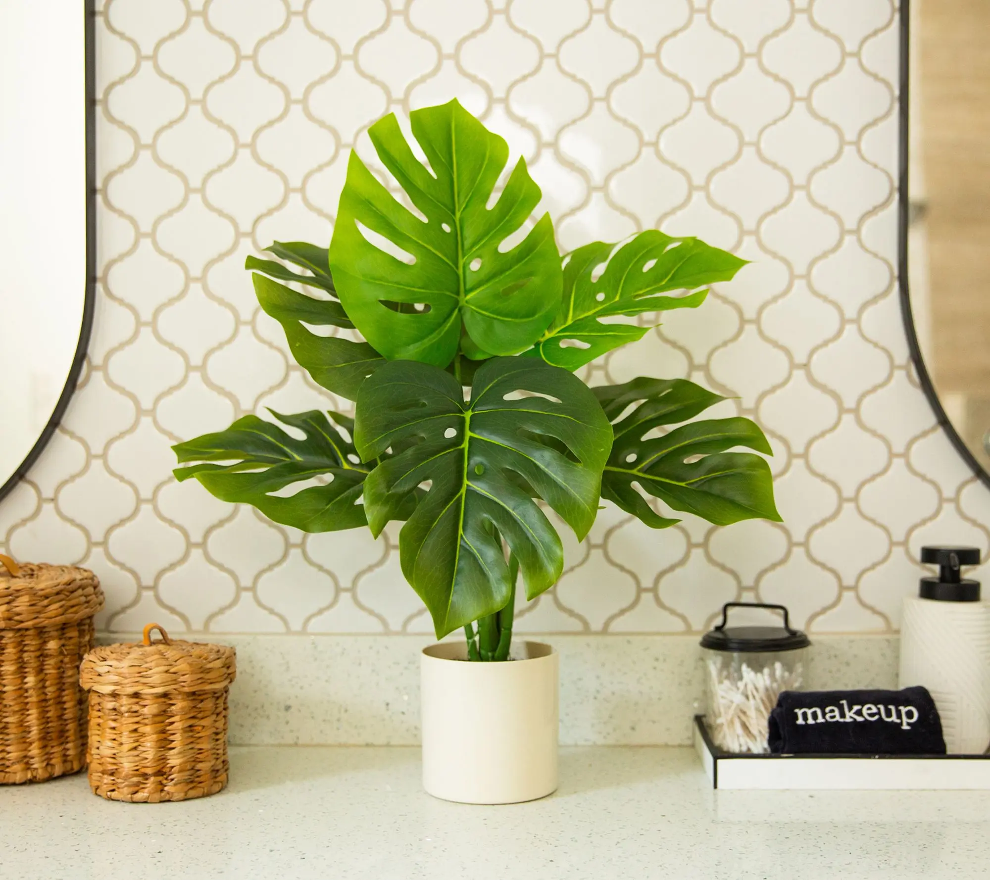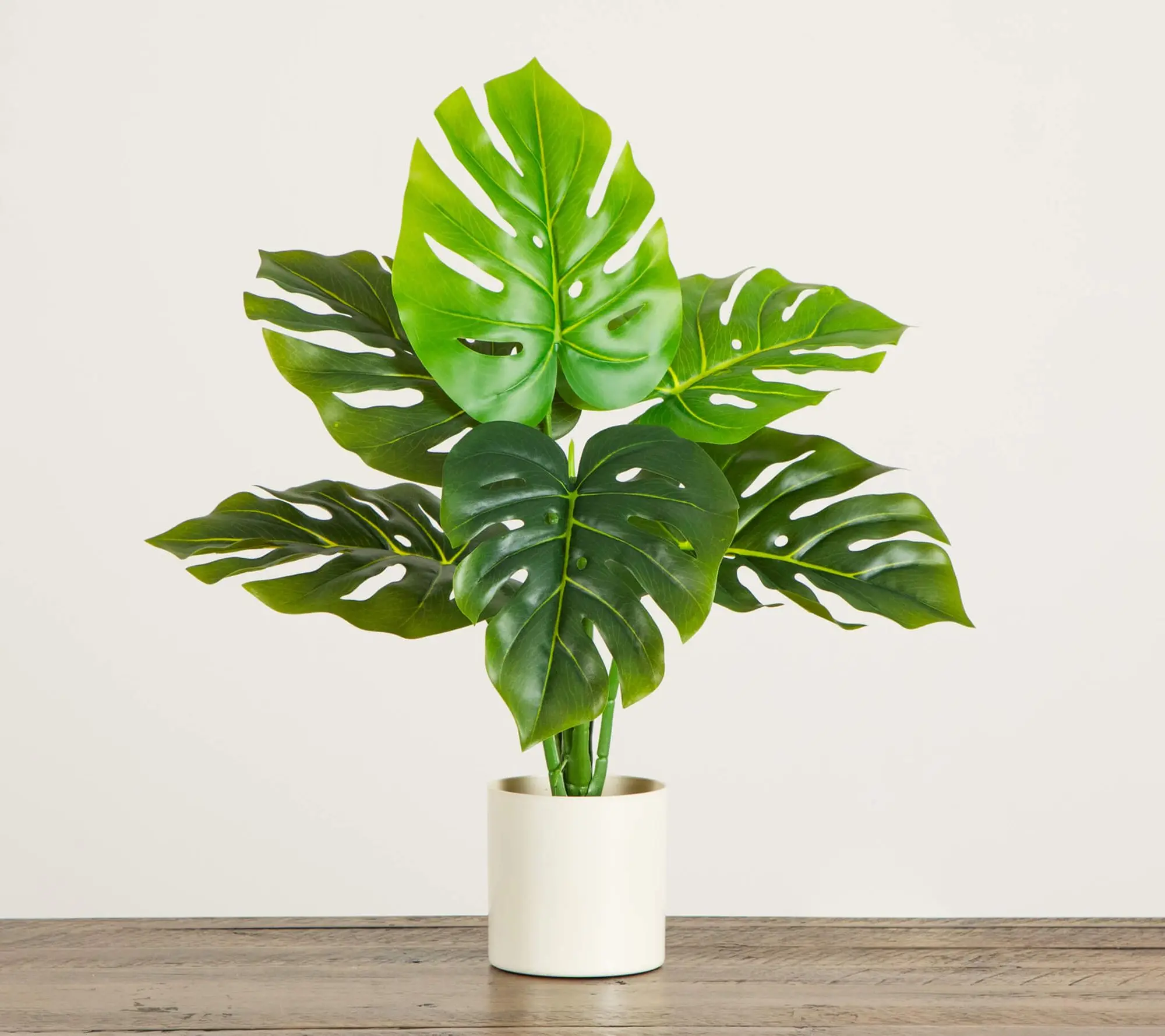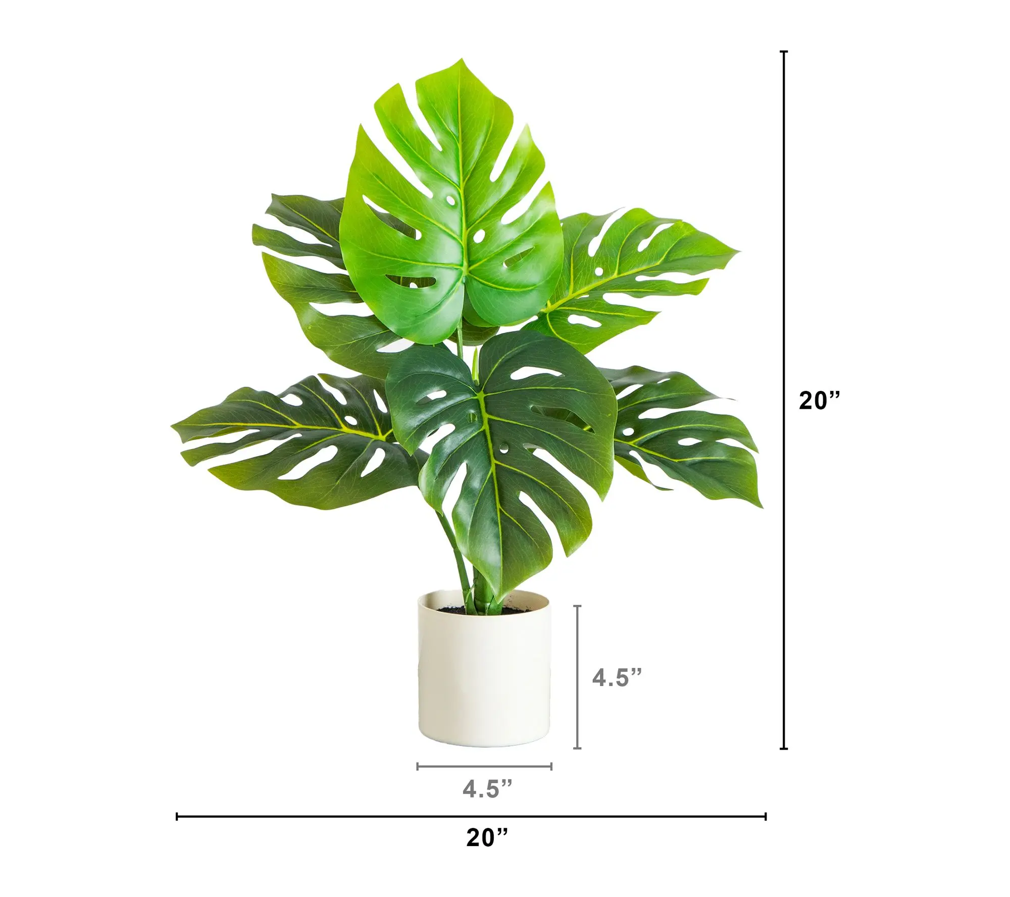 A burst of tropical style infuses your home with this artificial swiss monstera plant. Large, glossy leaves with signature splits bring bold character, while the lifelike finish and bendable branches invite you to shape a look that's all your own. Tuck it on your nightstand, entryway, or dining table and enjoy vibrant greenery any time of year. From Nearly Natural.