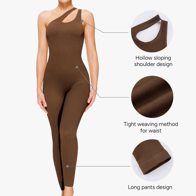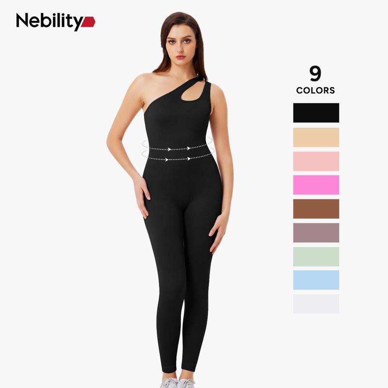 Nebility Women's Workout Seamless Yoga Ribbed Bodycon Jumpsuit Cut Out Asymmetric One Piece Leg Lengthening Tank Top Leggings Romper Stylish Activewear Stretchable All Season Solid Color Sports Jumpsuit