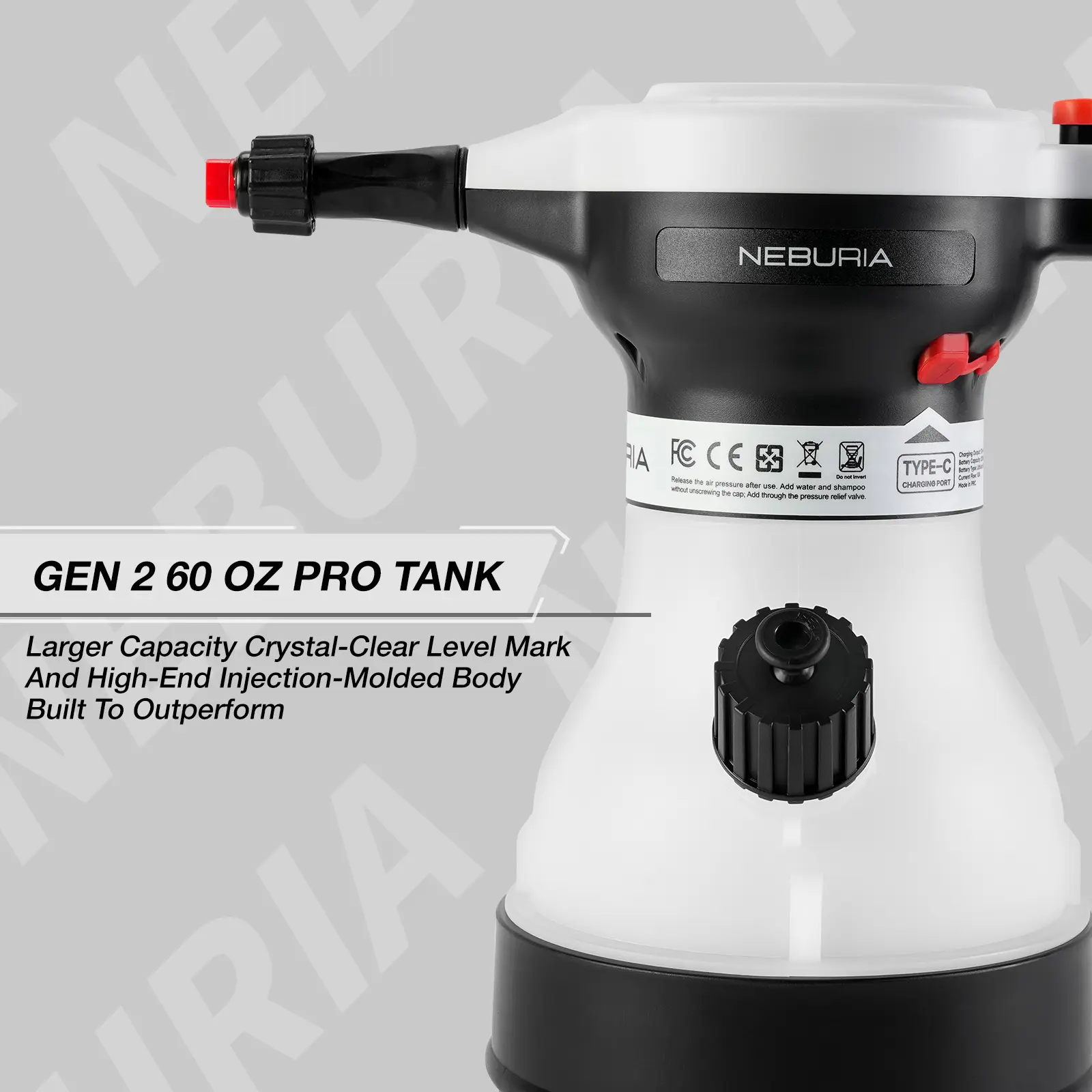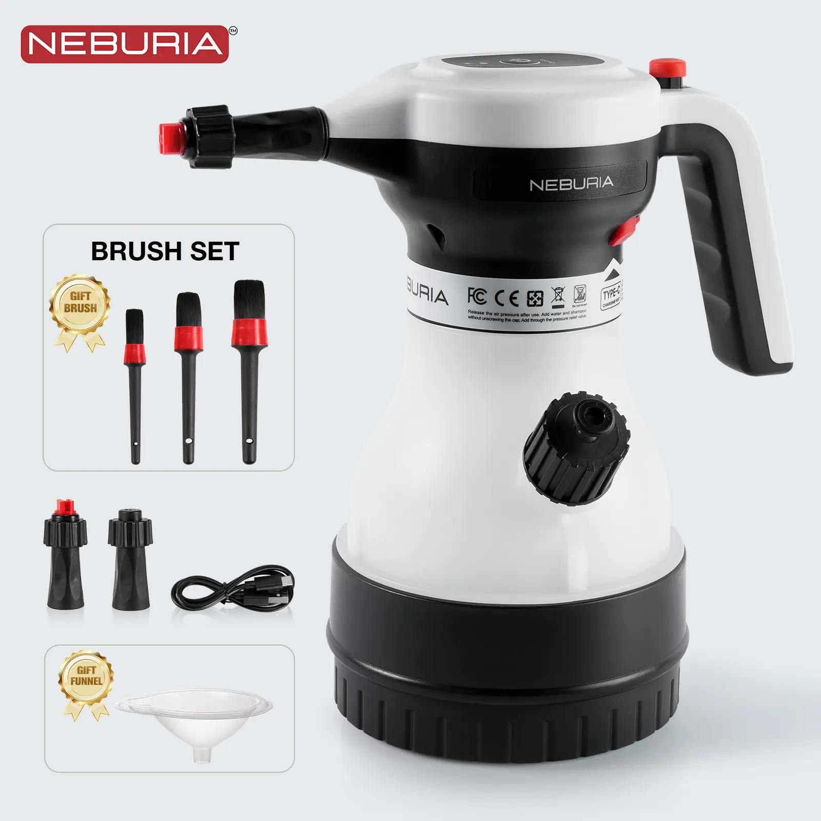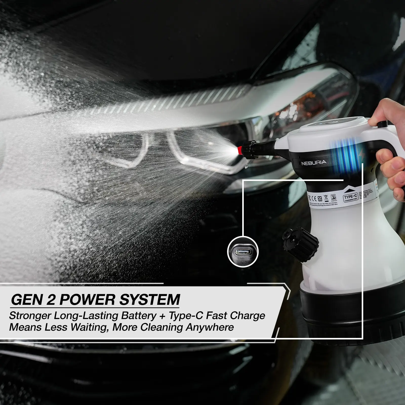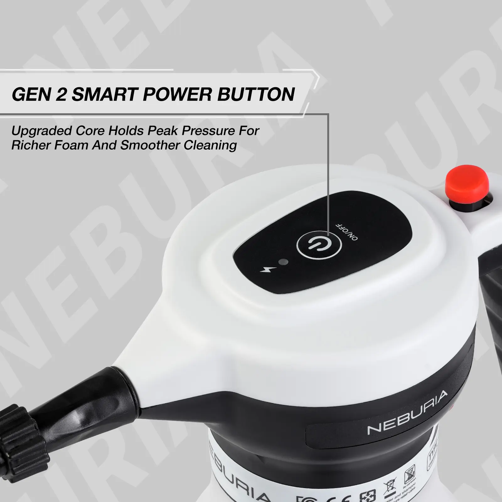 The NEBURIA Electric Foam Sprayer features a rechargeable battery and Patented Hybrid Pump, delivering powerful high-pressure foam at the push of a button. Smart Control ensures precise pressure management, reducing waste of foaming shampoo while providing efficient, effortless cleaning for cars, pets, and home use.
