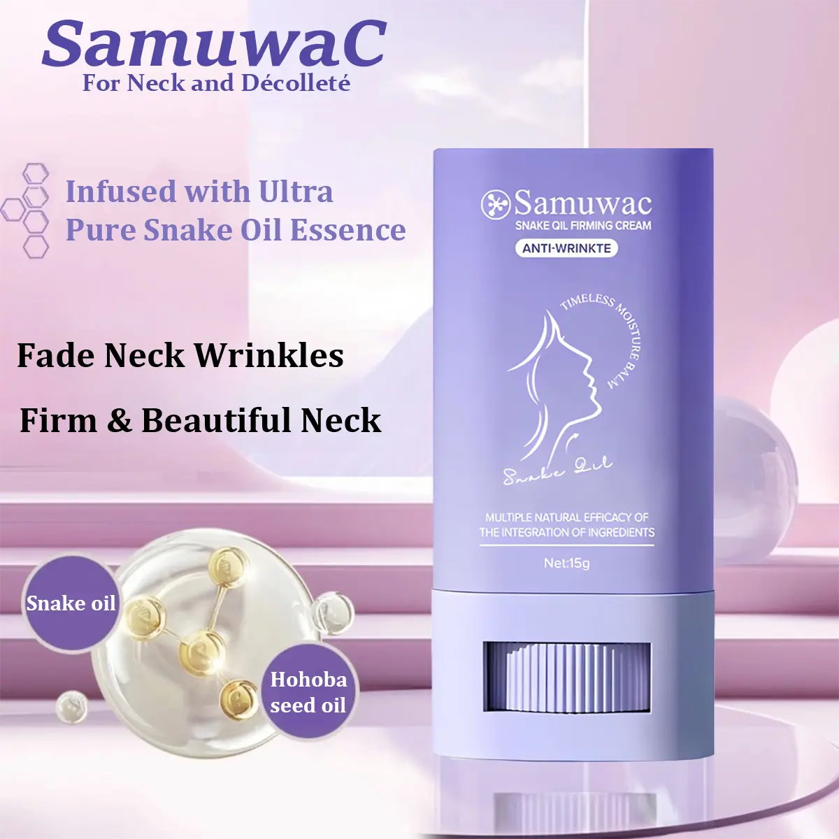 With the natural restorative power of Snake Oil and the deep moisturizing benefits of Jojoba Seed Oil, this Neck Contouring Stick deeply nourishes the skin, improving sagging and fine lines, making the neck area firmer and more elastic.