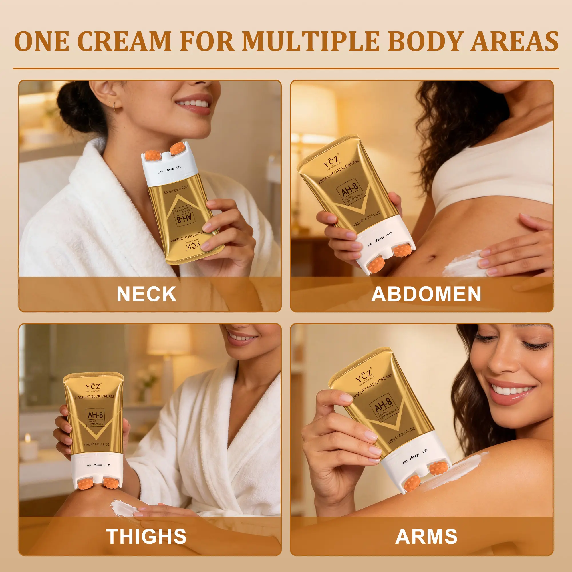 AH-8 tightens neck muscles (gentler than Vitamin A creams, safe for sensitive skin) + supportive ingredients: