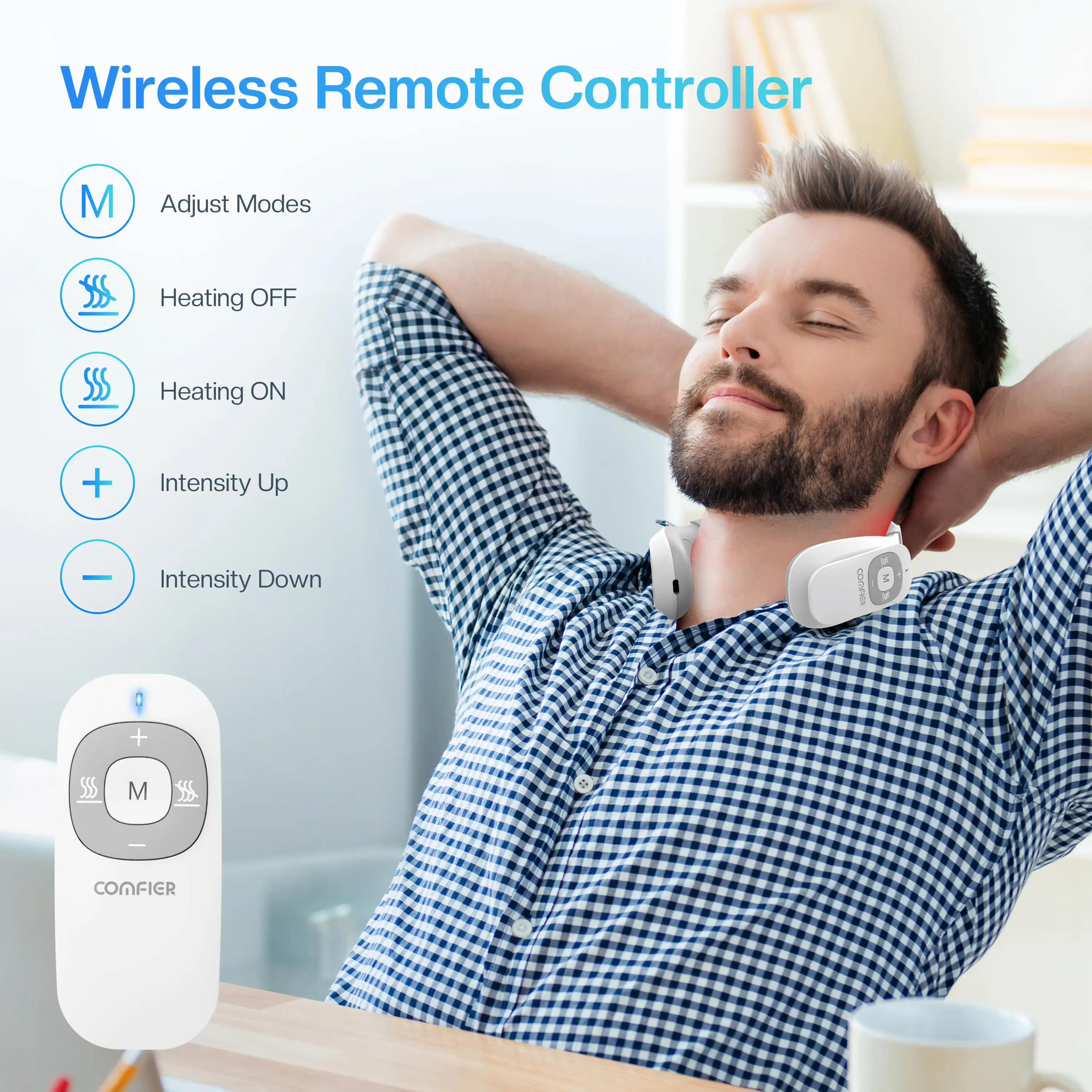 The neck electrode pads offer stimulation and heat to soothe the muscles. The main unit allows users to adjust intensity, switch stimulation modes, and control the ON/OFF and heating functions for maximum convenience.