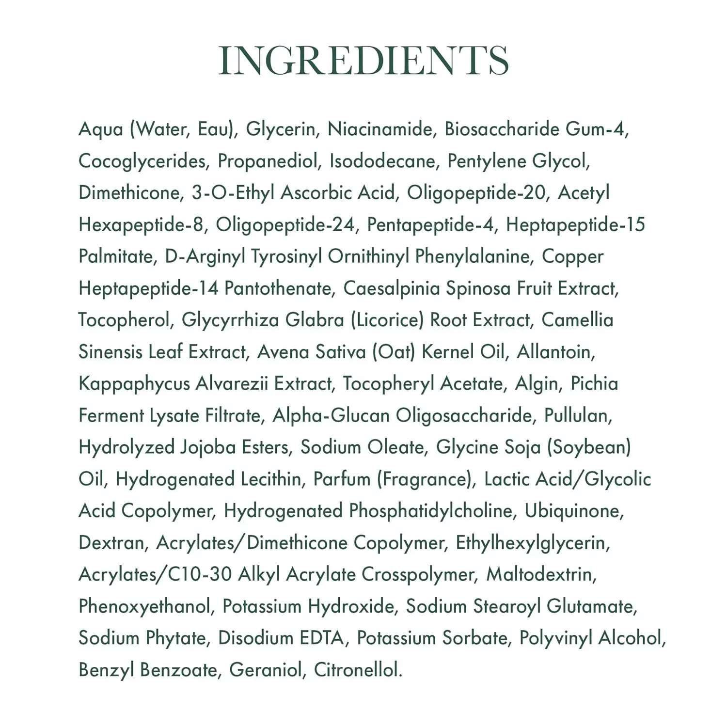 | Ingredients | Aqua (Water, Eau), Propanediol, Isononyl Isononanoate, Caprylic/Capric Triglyceride, Oligopeptide-24, Sodium Acetylated Hyaluronate, Sodium Hyaluronate, Sodium Hyaluronate Crosspolymer, Hydrolyzed Sodium Hyaluronate, Haematococcus Pluvialis Extract, Amber Powder, Ocimum Sanctum Leaf Extract, Curcuma Longa (Turmeric) Root Extract, Rhus Verniciflua Peel Cera/Wax, Cucumis Sativus (Cucumber) Fruit Extract, Chamomilla Recutita (Matricaria) Flower Extract, Lavandula Angustifolia (Lavender) Oil, Melia Azadirachta Leaf Extract, Aloe Barbadensis Leaf Juice, Melia Azadirachta Flower Extract, Corallina Officinalis Extract, Centella Asiatica Extract, Lupinus Albus Seed Extract, Melaleuca Alternifolia (Tea Tree) Leaf Oil, Coccinia Indica Fruit Extract, Solanum Melongena (Eggplant) Fruit Extract, Helianthus Annuus (Sunflower) Seed Oil, Glycerin, Simmondsia Chinensis (Jojoba) Seed Oil, Tocopheryl Acetate, Bisabolol, Aloe Barbadensis Flower Extract, Ocimum Basilicum (Basil) Flower/Leaf Extract, Moringa Oleifera Seed Oil, Tocopherol, Sodium Oleate, Glycine Soja (Soybean) Oil, Allantoin, 1,2-Hexanediol, Hydroxyacetophenone, Acrylates/C10-30 Alkyl Acrylate Crosspolymer, Polyurethane-79, Carrageenan, Maltodextrin, Cellulose Gum, Silica Silylate, Pentylene Glycol, Ethylhexylglycerin, Phenoxyethanol, Disodium EDTA, Hydrogenated Lecithin, Sodium Hydroxide, Linalool. |