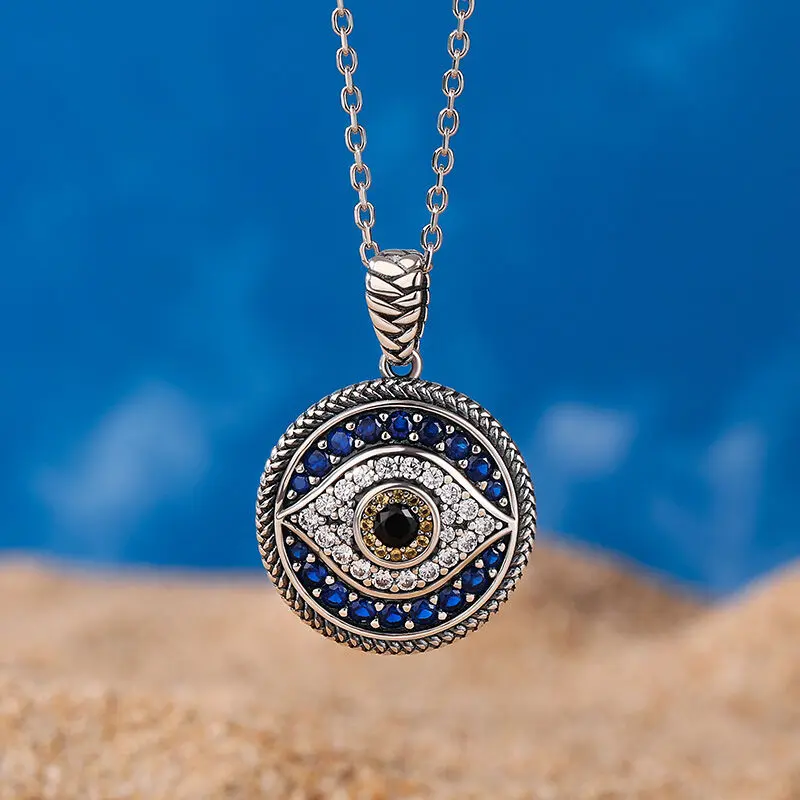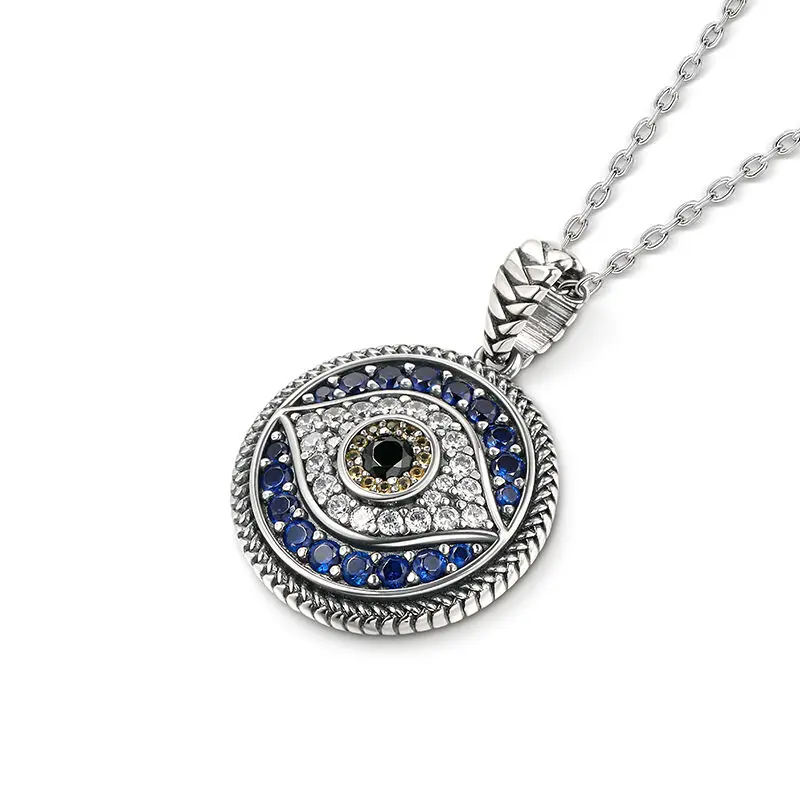 The evil eye symbol has long been associated with good luck and protection, making this necklace a great talisman for anyone who believes in its power. Crafted in sterling silver, it's very fashionable and perfect for everyday wear. This piece features sliver in a halo design that surrounds the blue stones, and a protective evil eye symbol. Whether for a birthday, anniversary, or other special occasions, this necklace makes a great gift for anyone who loves unique, eye-catching jewelry.