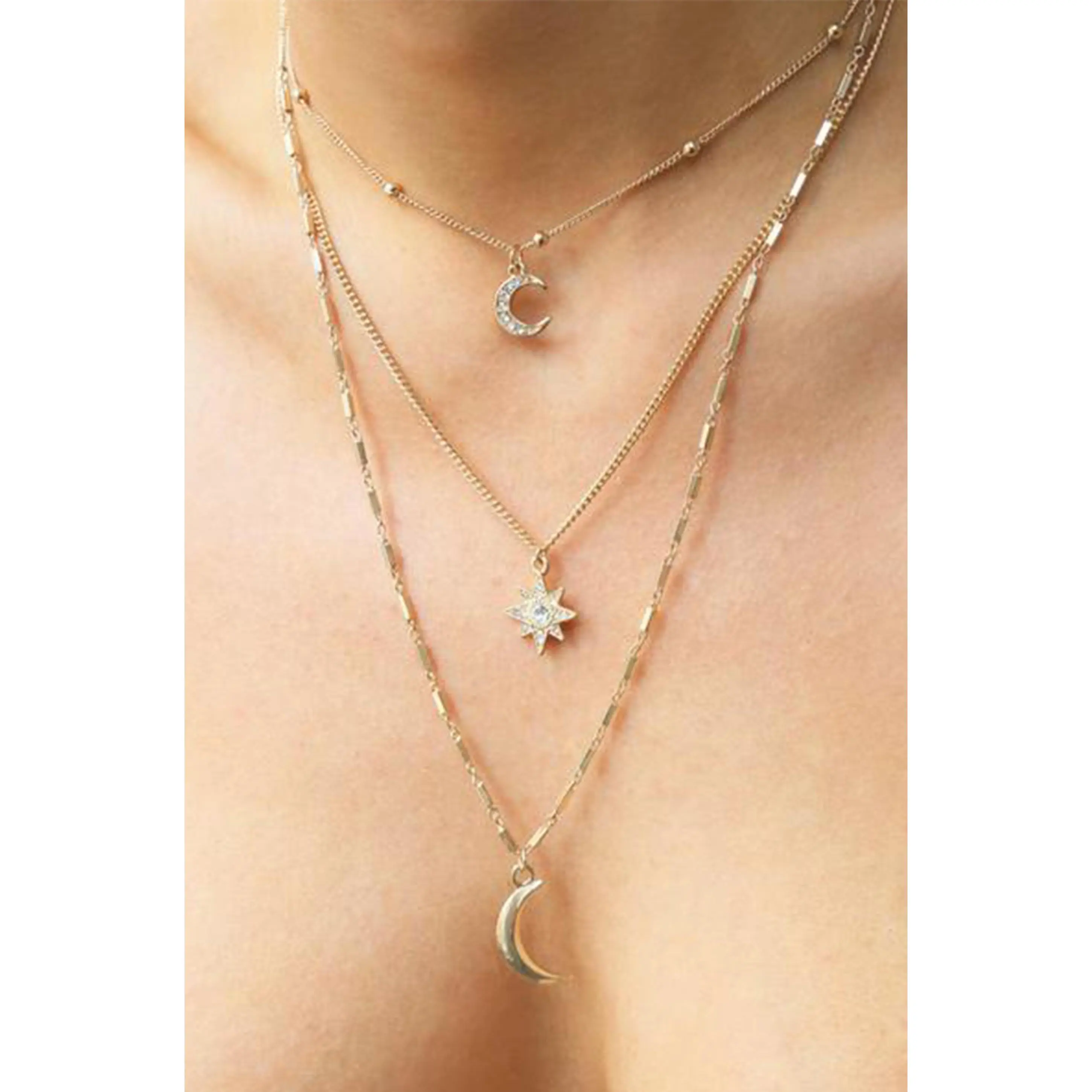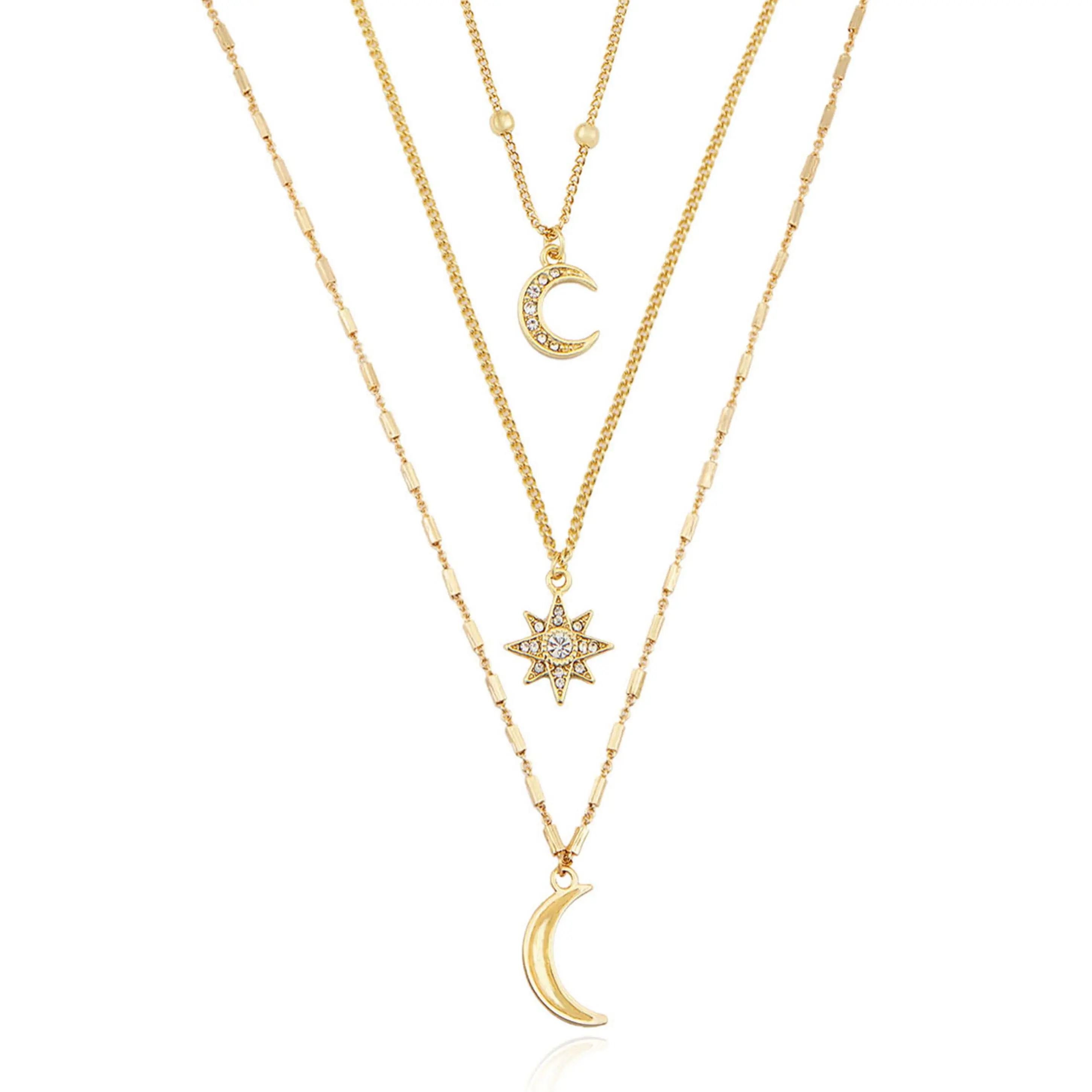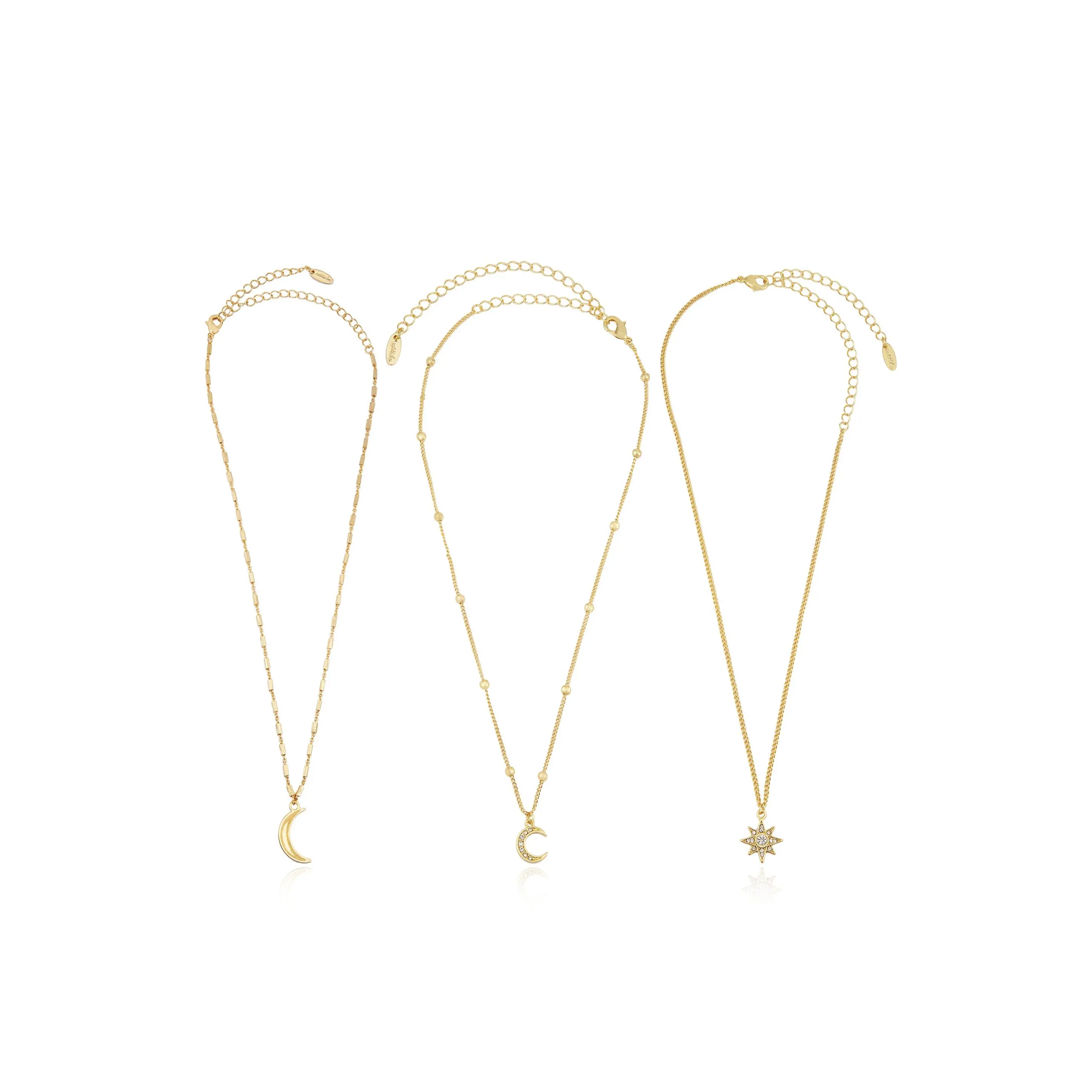 ✨ Ettika Night Sky Necklace Set with Moon Pendant, Star Design, and Chain. This luxurious 18kt gold plated trio of necklaces is hypoallergenic and nickel free. Each necklace comes with a 5" extender, allowing for versatile wear. The set includes three necklaces: Crystal Moon, Crystal Star, and Large Moon.