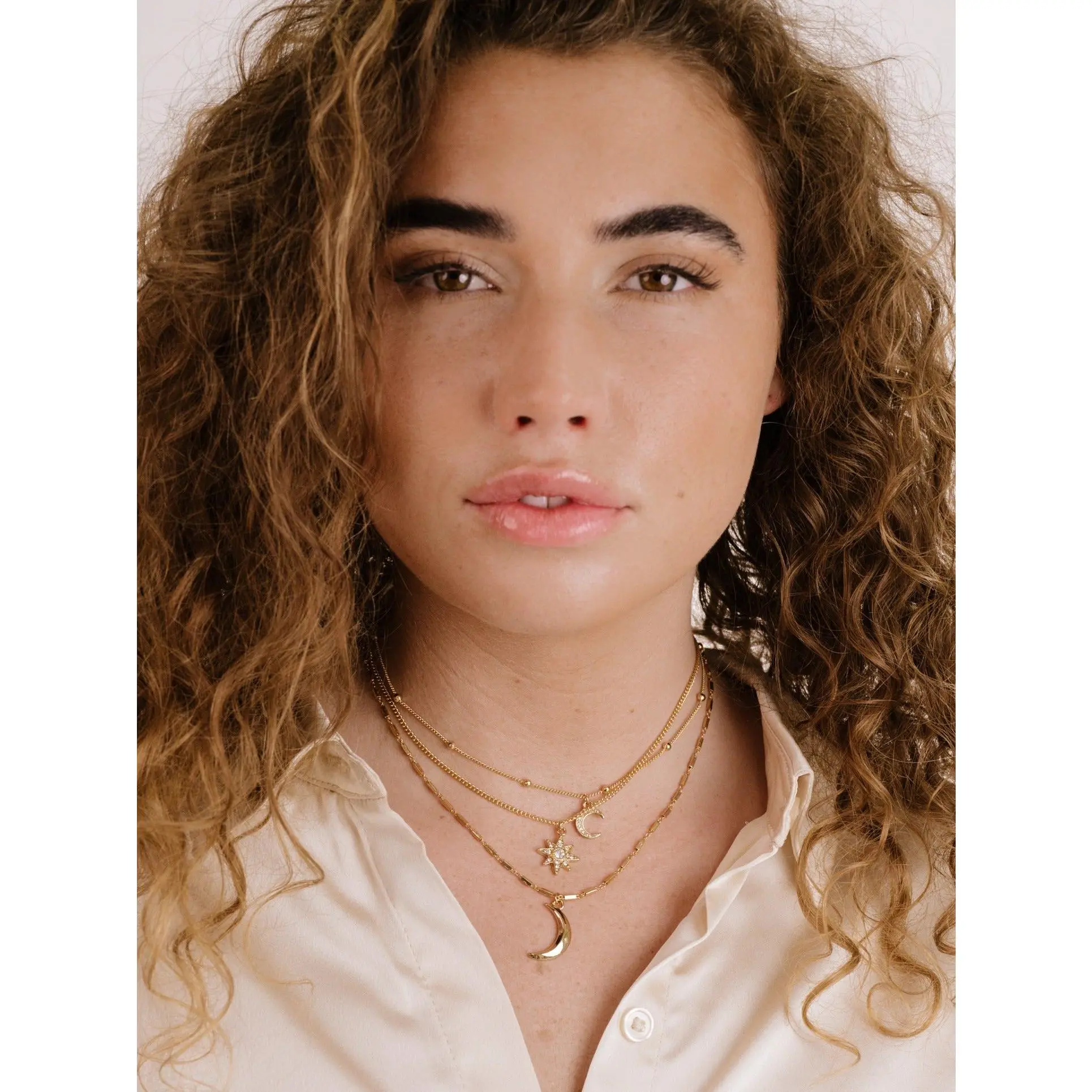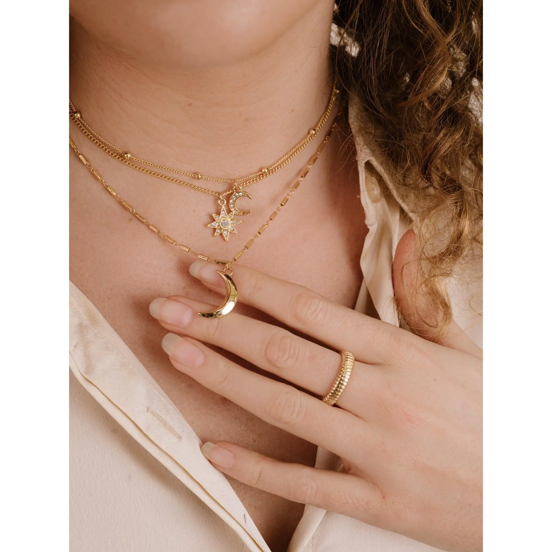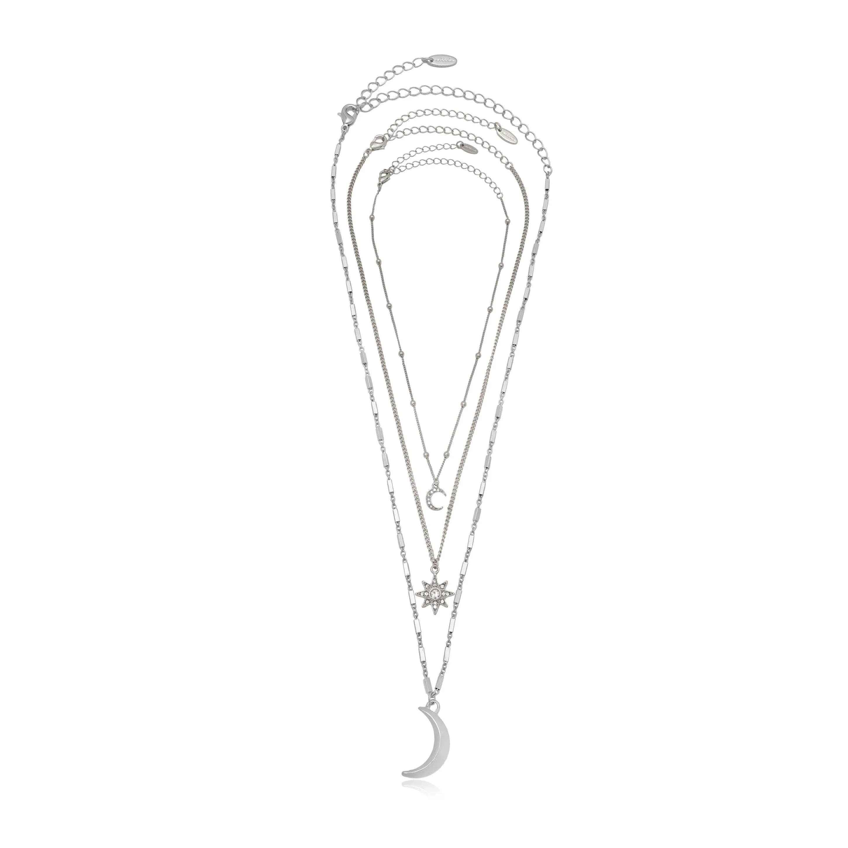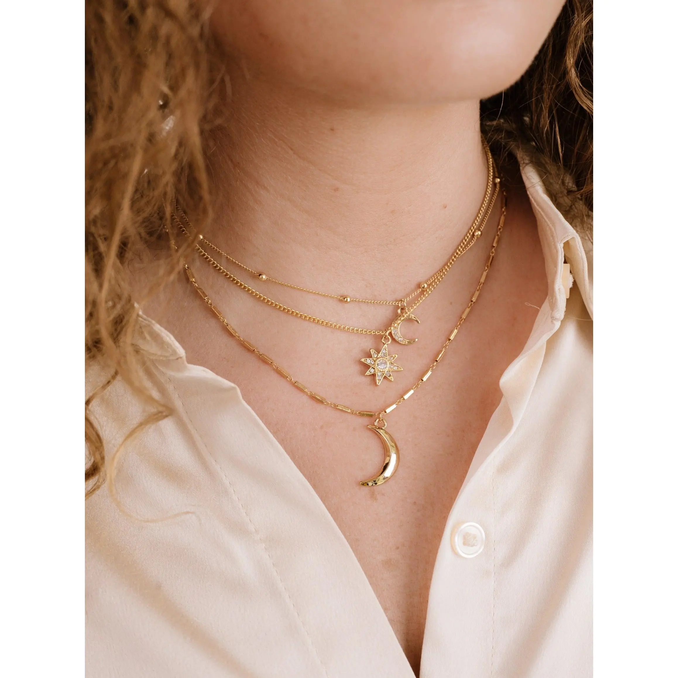 ✨ Ettika Night Sky Necklace Set with Moon Pendant, Star Design, and Chain. This luxurious 18kt gold plated trio of necklaces is hypoallergenic and nickel free. Each necklace comes with a 5" extender, allowing for versatile wear. The set includes three necklaces: Crystal Moon, Crystal Star, and Large Moon.