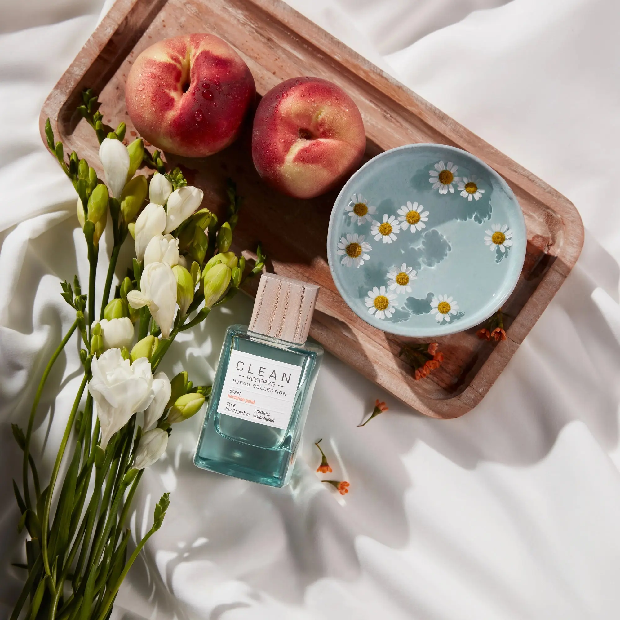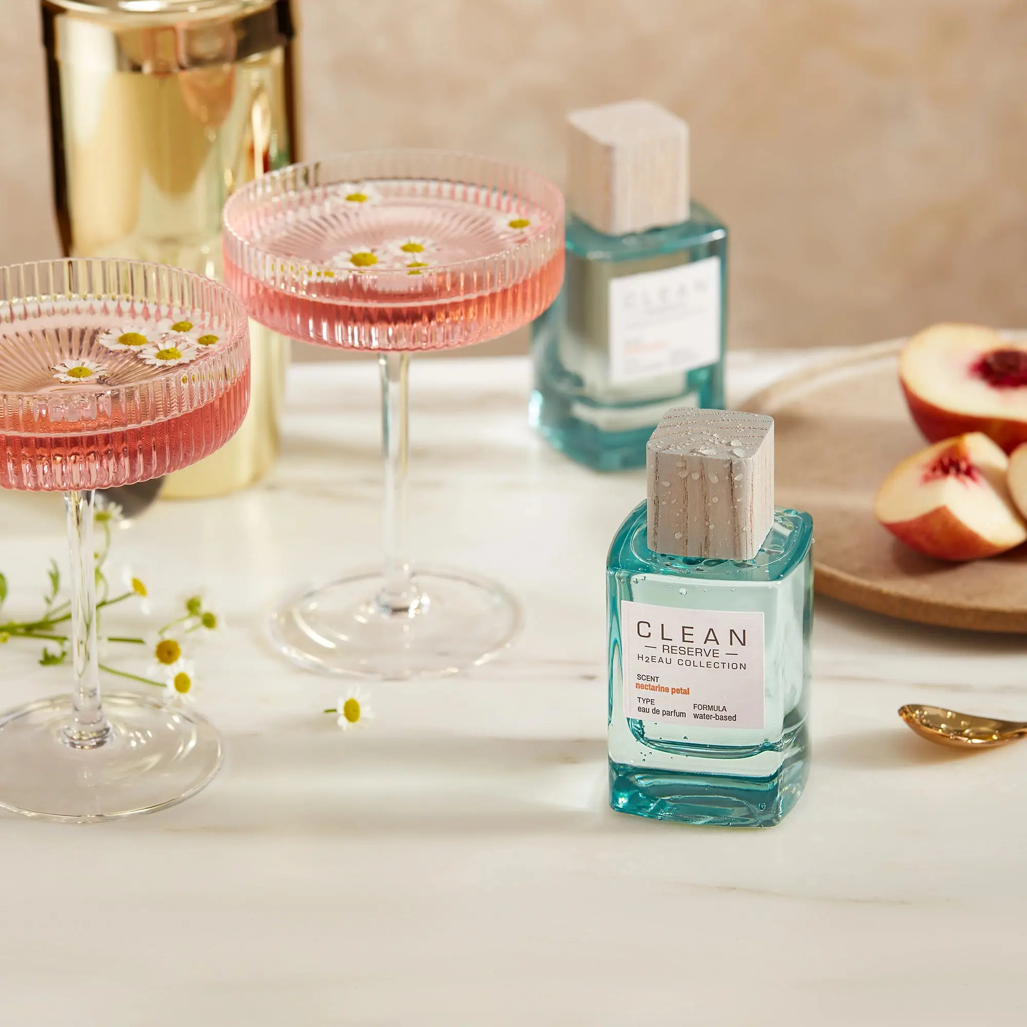 Luscious & Irresistible. Inspired by Springtime’s succulent nectarine sweetness and luminous flower petals. Mouthwatering nectarine journeys through a wild garden of golden chamomile and peach blossoms before settling into a radiant and delectable blend of sweet amber and musk.