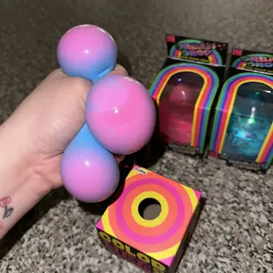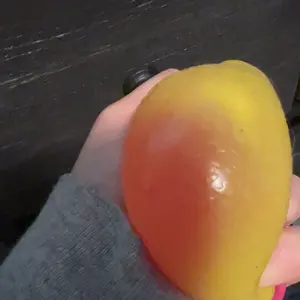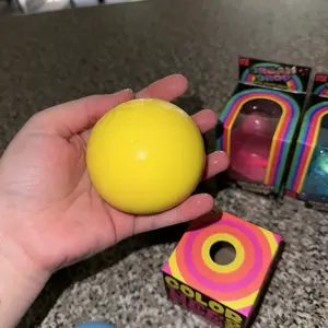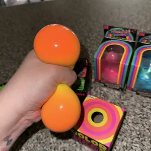 Super fun to squish & see the color change. The blue turns like a pinky/purple color and the yellow turns orange. The more you wash them though it’s like they get a tacky feeling on the outside.