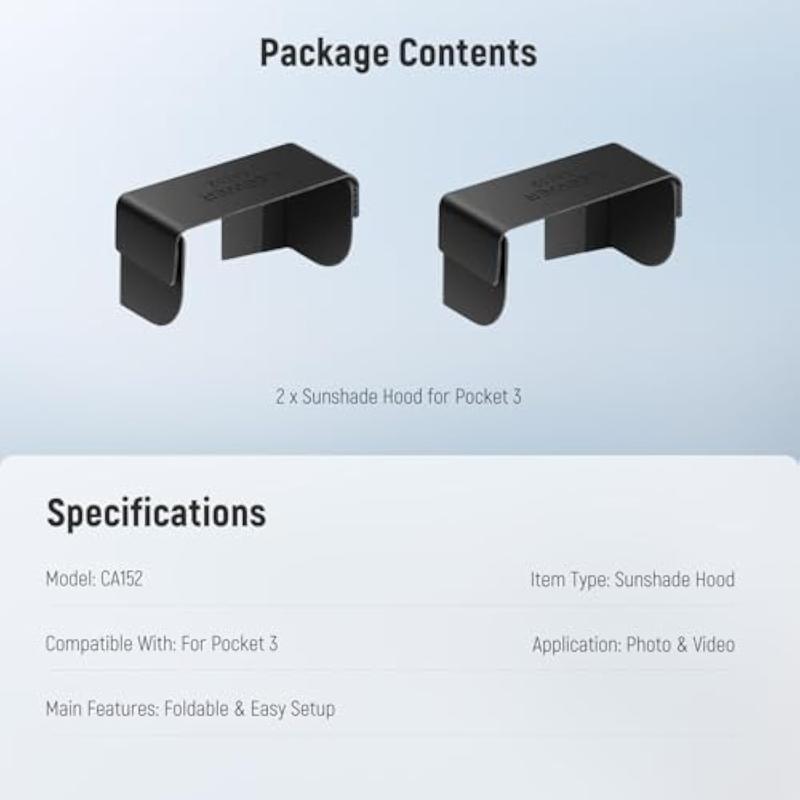 NEEWER BASICS presents an economical sunshade hood designed specifically for Pocket 3. It effectively reduces glare for better visibility while allowing easy access to the screen and touchscreen functionality. The sun hood is simple to set up, portable, and made from a comfortable PU exterior and plush interior that protects against scratches. This convenient two piece set provides excellent sun protection for outdoor photography, with an additional piece for sharing or as a spare.