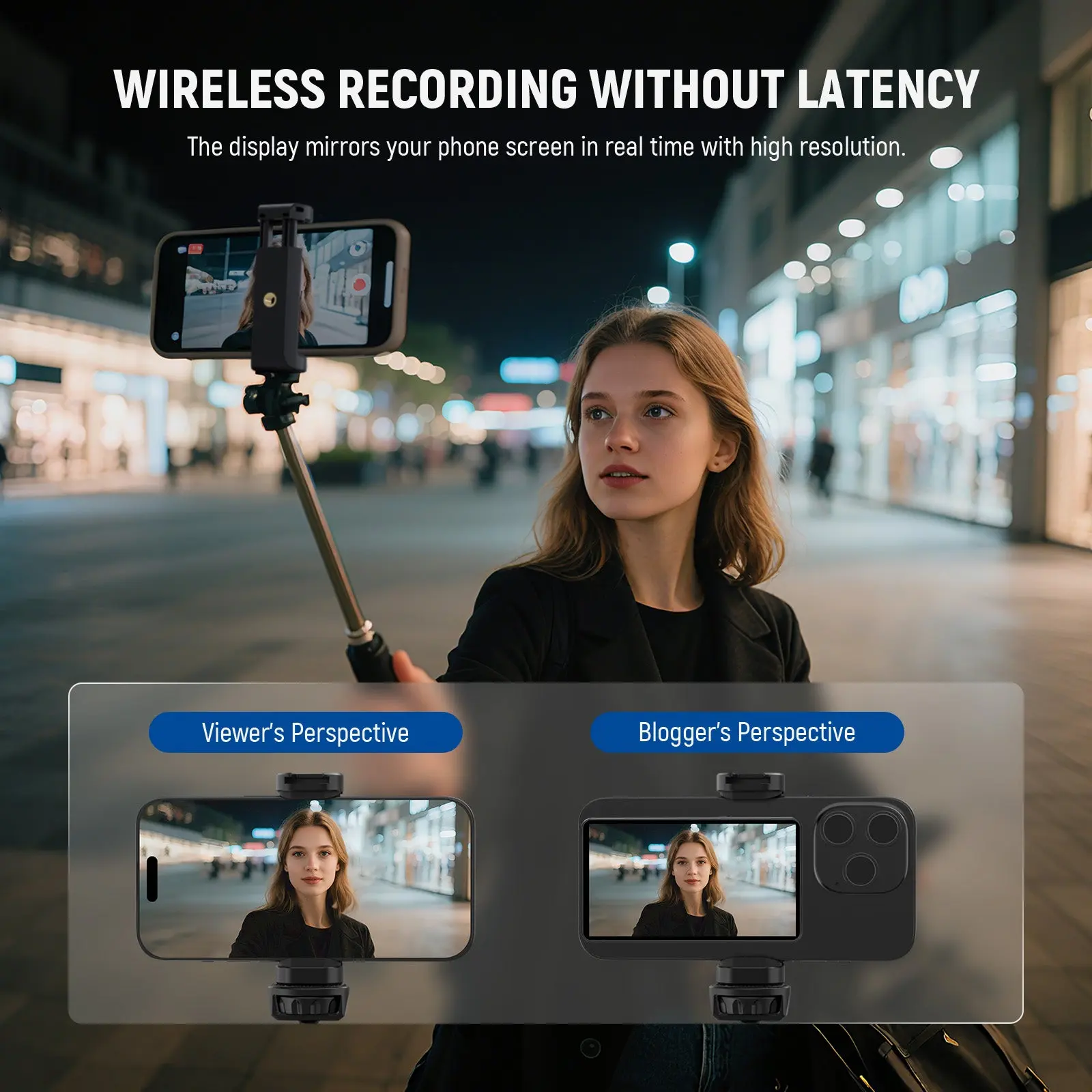 ·Wireless Recording without Latency- The phone back camera monitor mirrors your cellphone screen with high resolution in real time, ideal as streamer social media influencer must have for selfies, vlogging, live streaming, for YouTube TikTok video recording, etc. Adjustable brightness ensures clear viewing even in bright light. Enjoy wireless shutter control via the remote