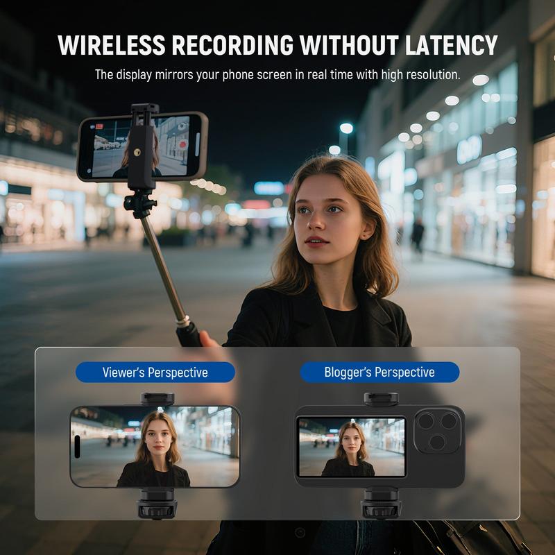 ¡Wireless Recording without Latency- The phone back camera monitor mirrors your cellphone screen with high resolution in real time, ideal as streamer social media influencer must have for selfies, vlogging, live streaming, for YouTube TikTok video recording, etc. Adjustable brightness ensures clear viewing even in bright light. Enjoy wireless shutter control via the remote