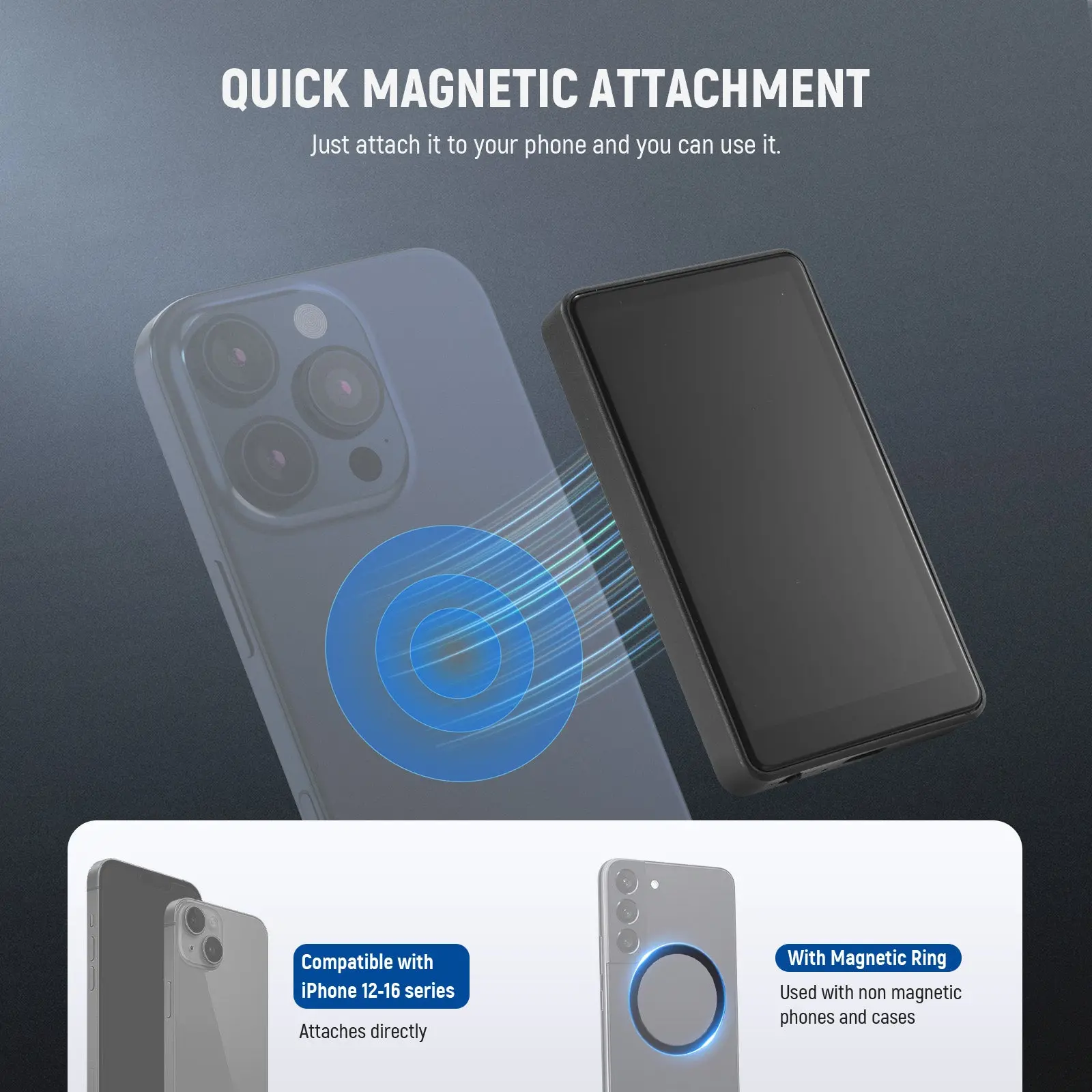 ·Quick Magnetic Attachment- Magnetically attach the mini back camera mirror monitor to compatible with MagSafe smartphones or phones in magnetic cases. Compatible with iPhone 16 15 14 13 Pro Max, etc., as cell phone photography and vlog filming accessories. For nonmagnetic phones, use the magnetic ring. NOTE: NOT compatible with iPhone 17 series and Google Samsung s25 Android, NOT for 4K recording