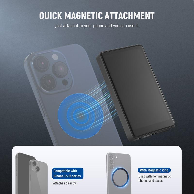 ¡Quick Magnetic Attachment- Magnetically attach the mini back camera mirror monitor to compatible with MagSafe smartphones or phones in magnetic cases. Compatible with iPhone 16 15 14 13 Pro Max, etc., as cell phone photography and vlog filming accessories. For nonmagnetic phones, use the magnetic ring. NOTE: NOT compatible with iPhone 17 series and Google Samsung s25 Android, NOT for 4K recording