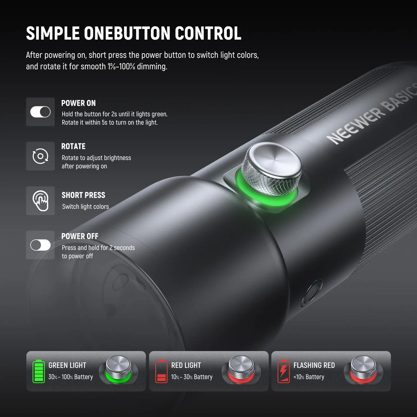 ·One Button Control & Smart Battery Indicator- Featuring a convenient one button control design, the flashlight for photography allows easy color switching with a short press of the power button after turning it on. Or rotate it to adjust the brightness from 1%-100%. Integrated with an indicator light that signals the battery status: solid green for 30%-100%, solid red for 10%-30%, and flashing red for below 10%
