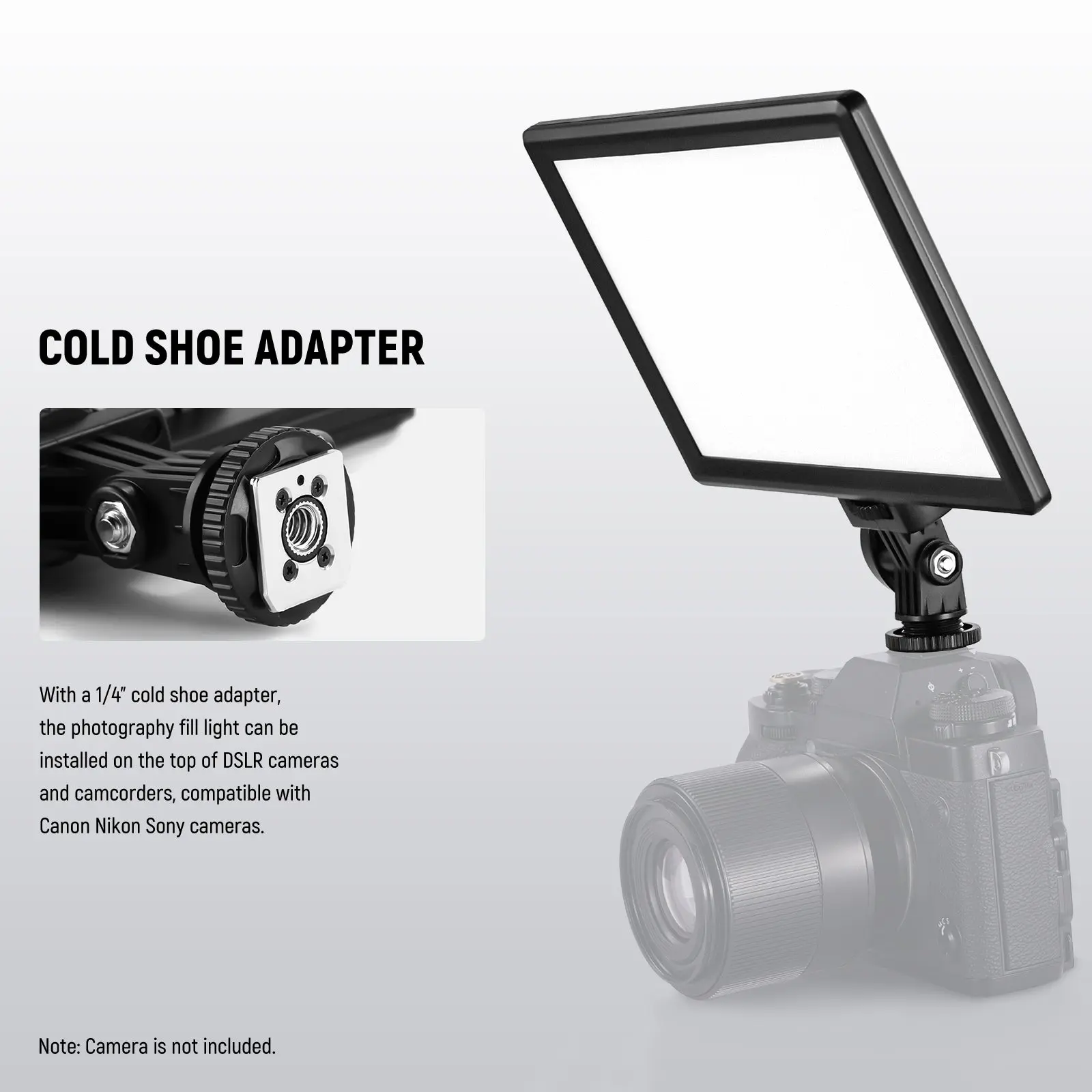 ·Flexible Mounting with Cold Shoe Adapter- With a 1/4" cold shoe adapter, the photography fill light can be installed on the top of DSLR cameras and camcorders, compatible with Canon Nikon Sony cameras, and allows for 180° front and back tilt for your desired shooting angles