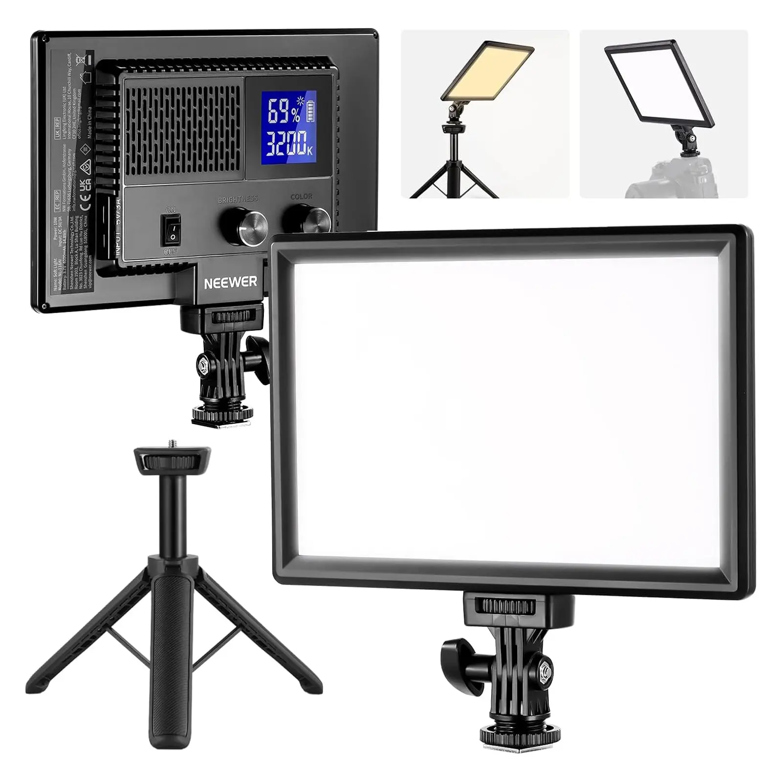 ·Versatile LED Video Light Panel Kit- The 9" LED video light features 58 warm and 58 cool LEDs, delivering a 10W max output with a max illumination of 600lux/0.5m and a high color rendering index (CRI) of 95+, ideal for portraits, video studio photography, product photography, live streams, etc. Also with a mini tripod for height adjustment, a cold shoe adapter for angle positioning, a USB cable, and a 4000mAh built in lithium battery for charging. Note: Carry Bag is NOT included